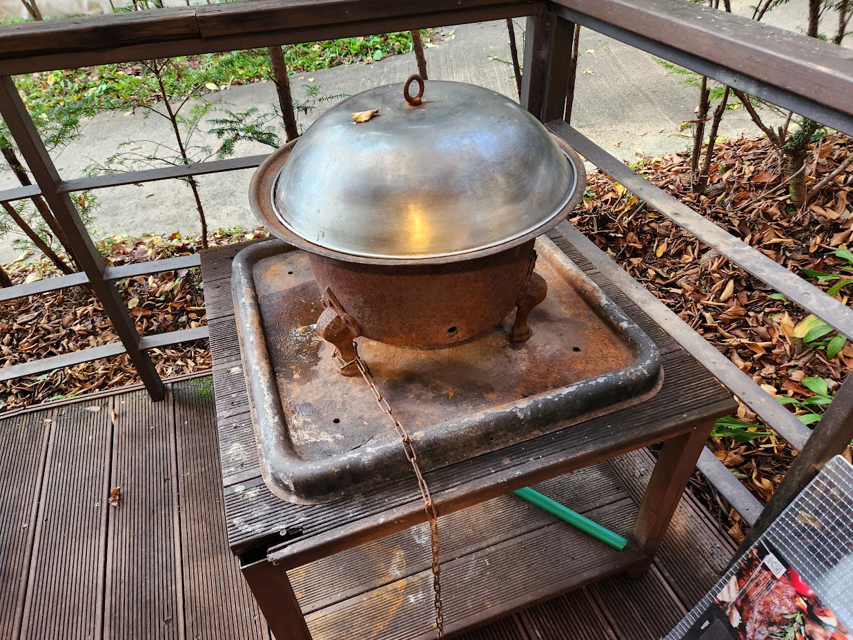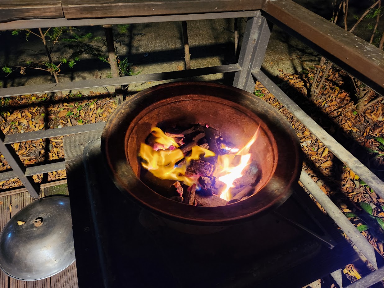 위에도 적었지만 하우스와 달리 바깥 활동 부분은 캐노피가 아닌 나무 테이블 위에 그냥 파라솔이 쳐진 것입니다. 햇볕은 그런대로 막아주지만 비가 올 때는 정말 답이 없습니다. 화로대도 기본 제공되는 것은 같지만 날씨가 조금만 궃어도 무용지물이 되는 것이 슬플 뿐입니다.