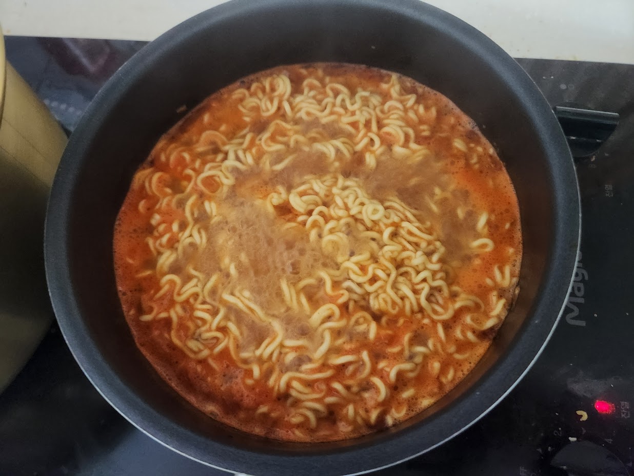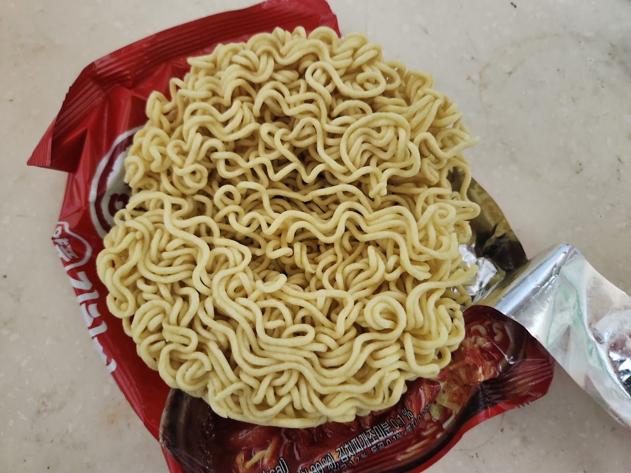 자... 이제 끓여봐야죠. 면이 가늘다보니 충격에 약해서 잘 부스러지는 것이 약점입니다. 이걸 사면 신주단지 모시듯 들고 오셔야 부스러기가 덜 나옵니다. 그리고 건더기는 정말 김치 쪼가리만 들어 있는데, 그것도 많이 든 편은 아닙니다. 그래서 비주얼을 보면 어쩔 수 없이 초라해집니다. 그래도 그 조차도 거의 안 보이는 오뚜기 김치라면같은 정말 저가형보다는 낫긴 나은데, 확실히 김치 건더기가 많이 보이는 틈새라면 매운김치보다는 확실히 하위 라인업인 것이 딱 끓여보면 보입니다.
