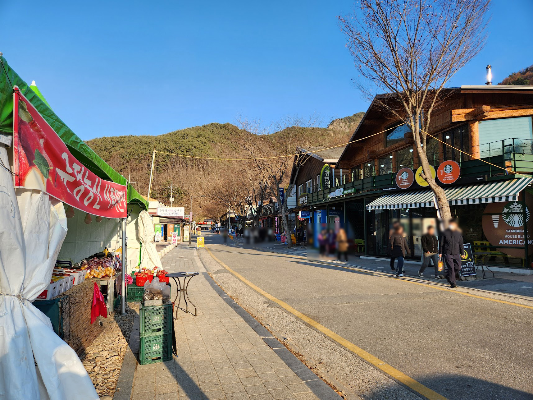 여기에 만족하지 못하신다면 캠핑장 동쪽(D 영지 방면)에 있는 출구 다리를 건너 보십시오. 이 캠핑장은 위에 적었듯이 주왕산의 핵심인 대전사 루트의 바로 입구에 있습니다. 등반로 입구에는 늘 식당이 있는 법. 당연히 편의점도 있고, 캠핑장 경계에서 100m 정도만 가면 GS25 편의점이 나옵니다. 특수지가 아니라 1+1같은 할인은 그대로 받을 수 있습니다. 청송의 상징인 사과도 살 수 있고, 사과 막걸리도 팝니다. 사과 막걸리는 어디가도 병당 2,500원이니 그냥 마음에 드는 곳에서 사시면 되겠습니다.
