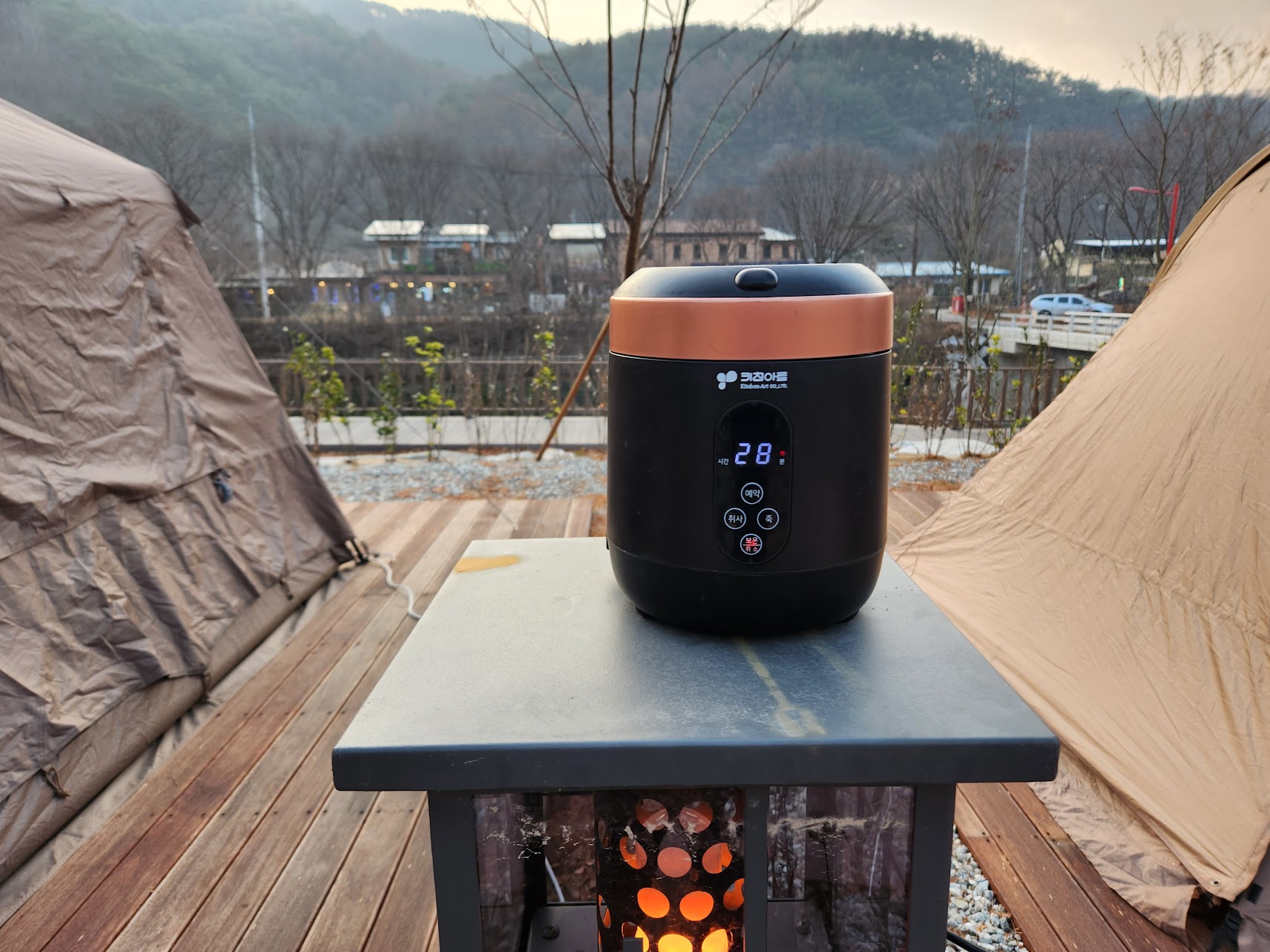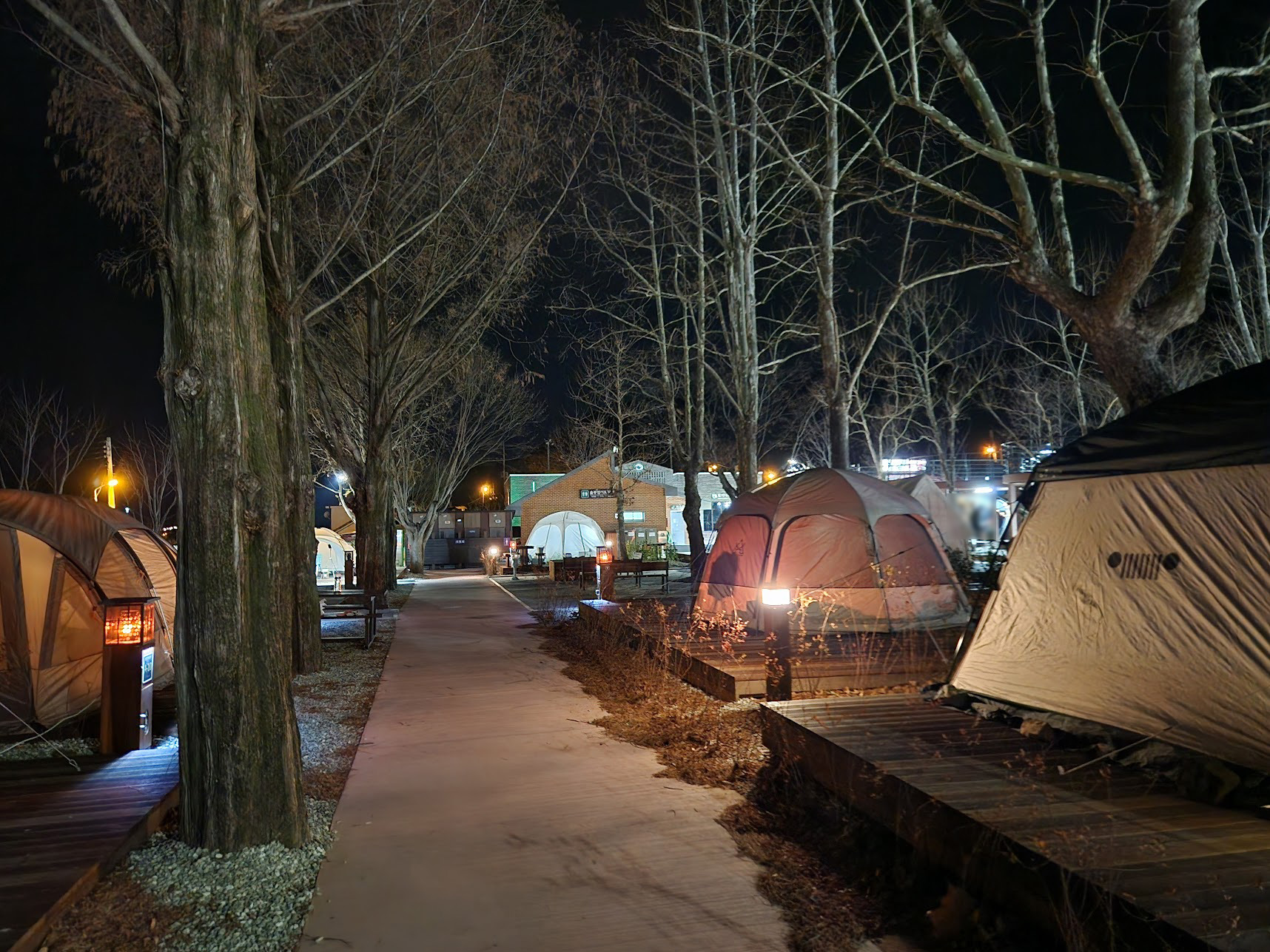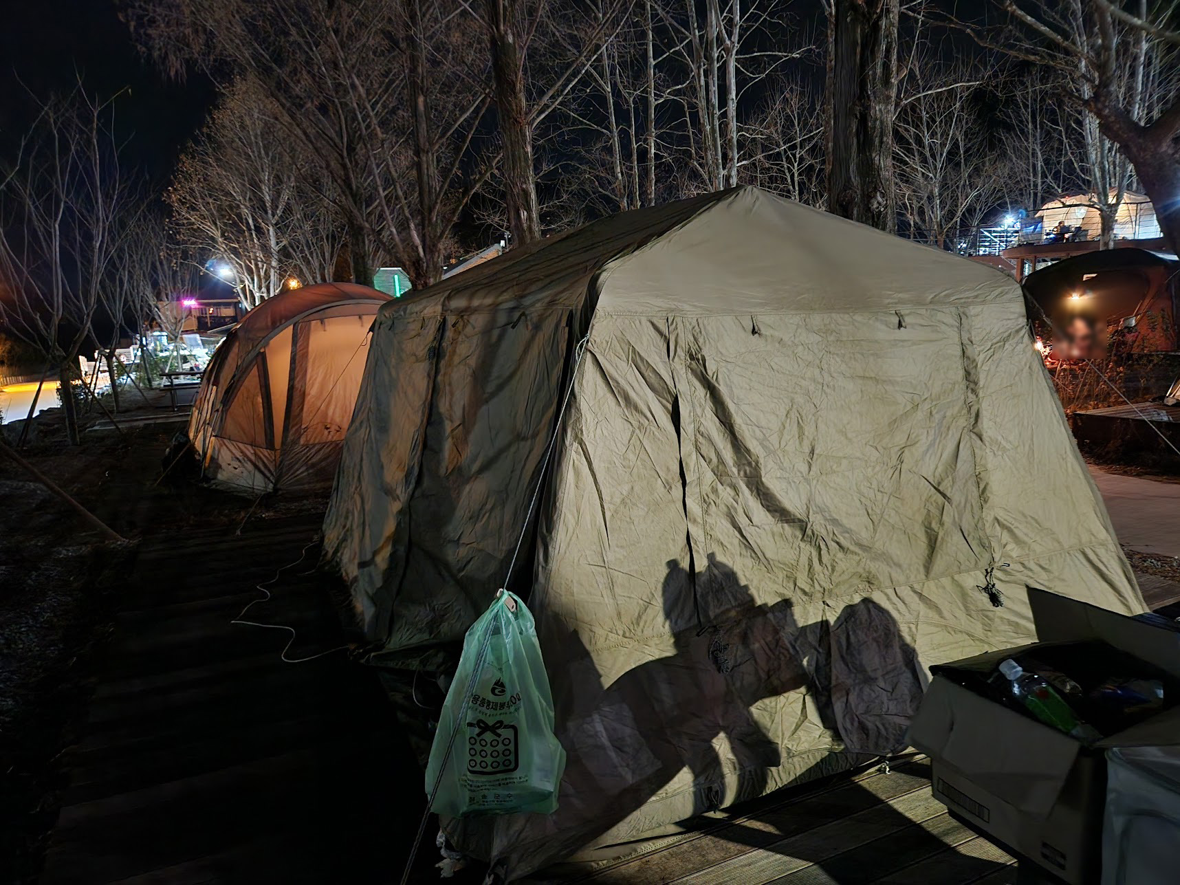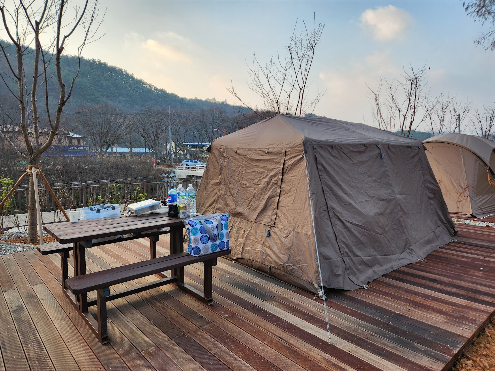 이렇게 바뀐 캠핑장의 모습에 나름 놀라면서 열심히 데크 위에 텐트를 칩니다. 이번에는 텐트 안에서 밥을 해먹는 것을 전제로 했기에 실외 테이블도 가져오지 않아 정말 후딱 텐트를 칩니다. 짐을 먼저 내려 놓은 뒤 주차로 골머리를 앓을 동안 그라운드시트와 텐트 본체가 세워졌고, 이후에 플라이를 올리고 실내 세팅을 끝냅니다. 잠시 휴식을 겸해 위에 사진을 올린 그 별다방 캡슐 카페에서 아아 한 잔을 뽑아 오니 전기장판에 열이 올라 슬슬 이불 속이 그리워지는 온도가 됩니다. 하지만 아직 이불 속으로 들어갈 수는 없었습니다. 왜냐면...