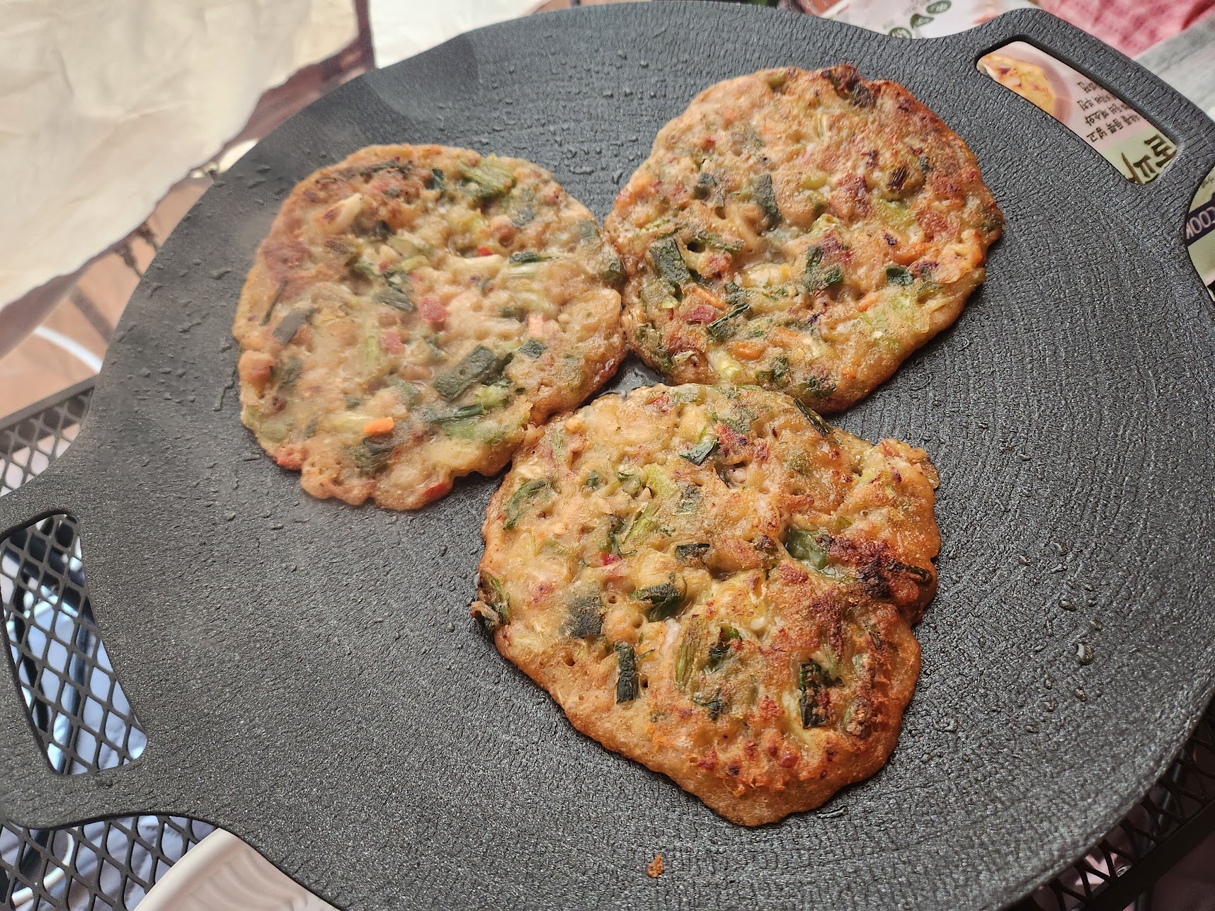 비주얼만 보면 꽤 괜찮아 보이지만 냉동식품이 다들 그렇듯이 퀄리티는 사실 좀 미묘합니다. 해물이 너무 잘게 들어간데다 파도 좀 짧게 썰려 있기 때문입니다. 그래도 바싹 구워주면 먹을만한 수준은 되지만 시간이 좀 필요하죠. 열심히 뒤집어가며 파전을 구워 텐트 치느라 고생하신 요리사에게 바치고 그제서야 이불 속으로 들어갑니다.