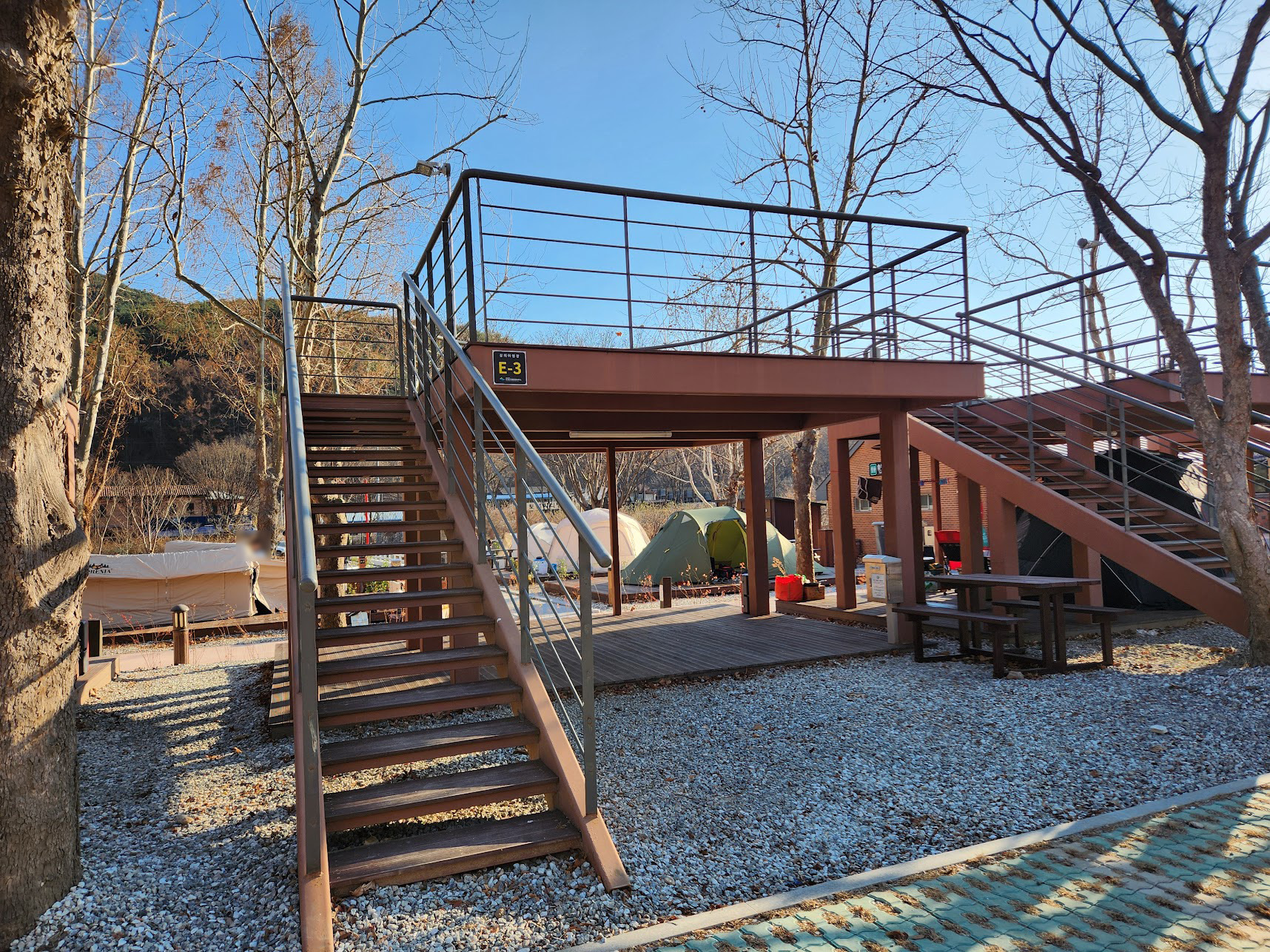 뭐 A 영지는 배치만 조금 바뀌고 전기 계통만 업그레이드가 되었다고 생각하시면 되지만 정말 크게 바뀐 것은 A 영지에서 독립한 E 영지입니다. 여기는 지금까지 듣도 보도 못한 형태로 영지가 바뀌었습니다. 무려 '2층 데크'입니다. 데크가 2층으로 되어 있어 텐트 두 개를 설치할 수 있는데, 텐트를 하나만 설치할 경우 경치 좋은 2층 또는 전등도 들어오고 비도 막아주는 1층 가운데 하나를 선택할 수 있습니다. 영지 하나를 두 개로 쪼갠게 아니라 이 2단 데크 하나가 영지 한 개입니다.