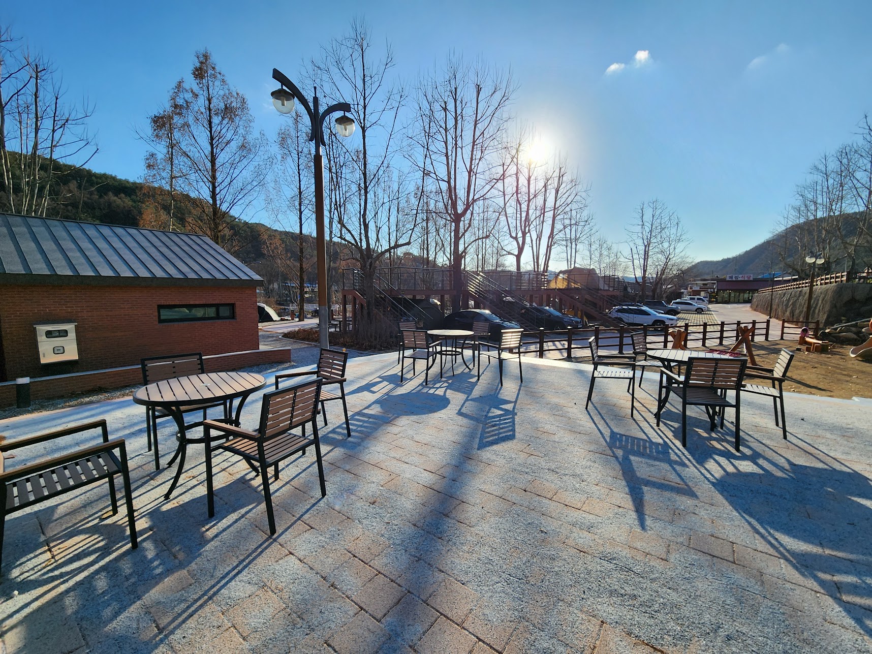 이제 나머지 시설도 둘러보죠. 1층 구석에 있던 좀 애매모호했던 어린이 놀이터는 좀 규모를 줄여서 놀이터는 리뉴얼을 하고 남은 공간을 노천 카페 형식으로 테이블을 배치했습니다. 사실 1층 중간에도 이러한 곳이 한 곳 또 있어서 경치를 즐기며 커피나 차를 즐기기에 좋습니다. 커피는 어디서 조달하느냐... 사실 이것도 뒤에 다 적어드립니다.^^