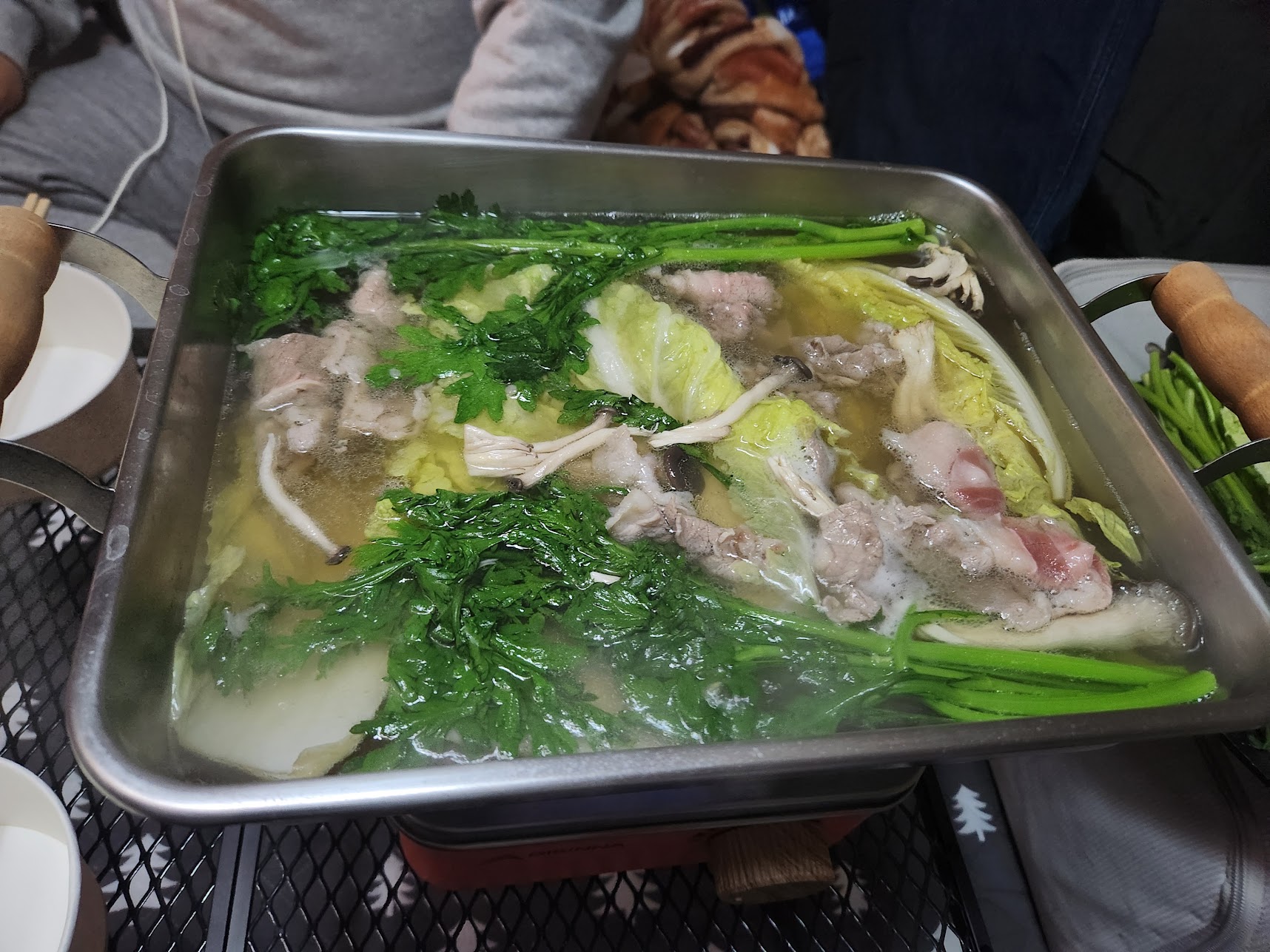 여러 포스팅에서 강조하지만 샤브샤브는 정말 캠핑에 적합한 요리입니다. 캠핑 요리는 밑준비가 간편해야 하며 조리도 간편해야 하면서도 어느 정도 맛있어야 하며 정리도 간편해야 좋은데, 샤브샤브는 이 점을 정말 완벽하게 만족합니다.밑준비라고 해봐야 야채를 간단히 씻는 것 말고는 없고, 육수에 잘 익은 야채와 고기는 속에 부담도 없죠. 육수도 시판용으로 나오니 요리를 못 해도 걱정할 것도 없으며 정리도 간편하니 정말 이 보다 좋은 캠핑 고기 요리도 없죠. 이번에는 심플하게 배추, 쑥갓, 버섯을 기반으로 우삼겹 1kg를 해치우는 물에 빠진 고기 파티를 텐트 안에서 벌였습니다. 다음 날 아침에 쓸 쑥갓만 약간 남기고 완벽하게 음식 처리 완료.