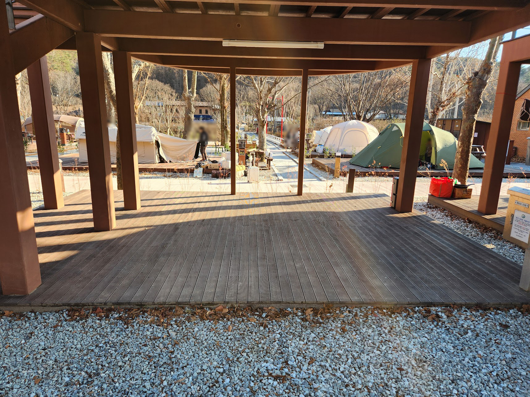 물론 이러한 구조 때문에 데크 하나의 크기는 좀 작아서 1층은 6m * 4.5m, 2층은 5m * 4.5m 정도라 2개 층 모두 대형 거실형 텐트 설치를 하기는 어렵지만 대신 돔텐트 설치는 이만한 곳이 없고, 오히려 텐트 두 개를 가져와서 친구끼리 또는 부부와 자녀가 서로 다른 텐트에서 지내는 것도 가능합니다. 예전에는 다른 명의로 두 개의 영지를 잡아야 했지만 하나로 해결이 되는 것입니다.