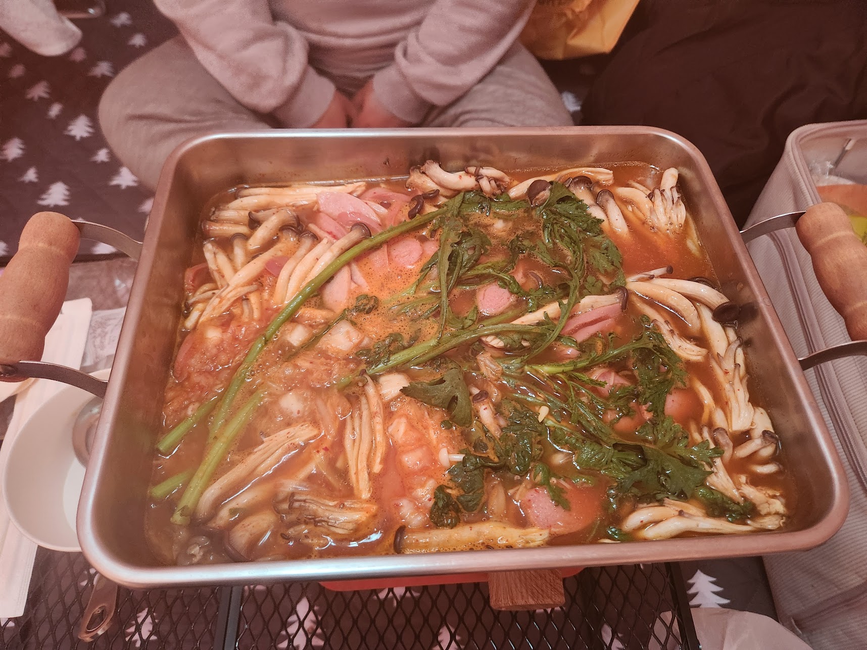 존슨 역시 캠핑에서 빼놓을 수 없는 날로 먹는, 그러면서도 좋은 요리입니다. 원조 밀키트가 존슨과 해물탕이라 할 정도로 캠핑과 존슨은 관계가 깊기도 한데, 전문점에서 포장해온 존슨을 냄비에 다 붓고 씹는 맛을 더하기 위해 700원짜리 느타리 한 팩과 어제 먹다 남은 쑥갓을 더해 의정부도, 송탄도, 파주식도 아닌 괴상한 존슨을 만들었습니다. 다만 이번에는 라면 사리는 넣지 않았는데, 3인용 존슨에 야채까지 더했으니 그것만으로도 배가 충분히 불렀기 때문입니다.