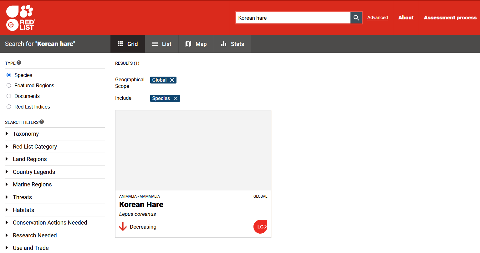 그 이외에는 산림 녹화를 원인으로 꼽기도 하는데, 과거 산림 녹화의 결과 숲이 너무 빽빽하게 우거진 나머지 햇볕을 받지 못한 지표면에서 풀이 잘 자라지 못하고 풀을 먹이로 삼는 토끼 개체도 줄었다는 것입니다. 요즘은 잦은 산불도 토끼 개체수를 줄이는 원인이 되긴 할 것입니다. 이렇게 웬만해서는 토끼 보기 힘든 세상이 되었지만, 그래도 군락지는 있어서 바로 멸종 위험은 아직 없다고 알려져 있습니다.