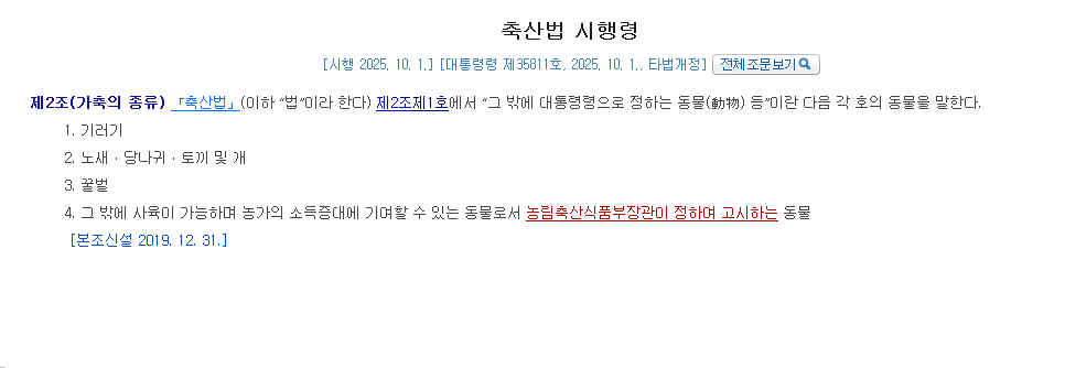 굵은 글자에 밑줄쳐진 것이 축산법 본법에 기재된 '메이저리그' 가축, 그냥 밑줄만 친 것이 축산법시행령에 기재된 '마이너리그' 가축, 이것도 없는 것이 축산법시행규칙(정확히는 고시)로 지정된 '독립리그' 가축 되겠습니다. 예. 고양이는 가축이 아닌 그냥 동물일 뿐입니다. 반대로 토끼는 마이너리그급이지만 일단 나라에서 지정한 분명한 가축 되겠습니다.