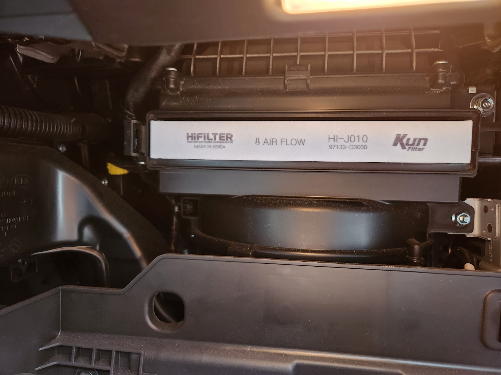 이제 새 필터를 장착합니다. 위에 적은 바와 같이 공기 방향을 정확히 맞춰 주셔야 나중에 재작업을 할 필요가 없어집니다. 이후에 에어컨 필터 커버를 왼쪽 가이드에 맞춰서 꽂고 밀어 고정시키고, 글로브박스를 적절히 위로 올린 뒤 양쪽의 스토퍼를 꽂아 반 바퀴 돌려 고정하고 글로브박스에 채울 것을 넣고 닫으면 작업은 끝납니다. 글로브박스에 정리할 것이 없다면 정말 작업은 5분, 아니 3분도 안 걸립니다. 실린더 분리를 꼭 해야만 하는 벨로스터보다 작업 단계가 한 단계 적어 그만큼 시간을 절약할 수 있습니다. 필터 하나에 4~5천원 정도, 시간 5분 정도만 있다면 정비소에 맡길 때 드는 5~6만원 이상의 지출을 아끼면서 차 안의 공기를 맑게 만들 수 있습니다. 겨울이 더 깊어지기 전에, 더 추워져서 밖에서 작업하기 싫어지기 전에 나와 동승자의 건강을 위해 에어컨 필터 한 번 바꿔 보심이 어떨지요?
