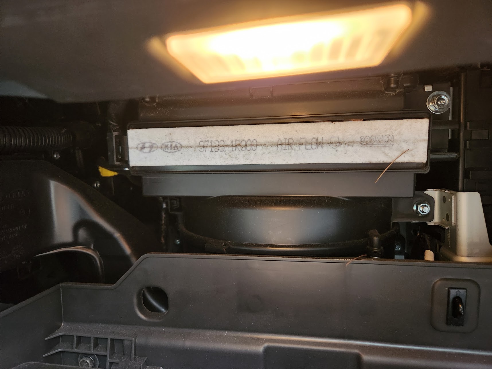 그 다음은 설명서에서는 글로브박스 오른쪽에 있는 실린더를 풀라고 되어 있는데... 다행히도 코나는 이 과정을 생략해도 됩니다. 이걸 안 해도 에어컨 필터 교체에 큰 불편이 없습니다.옆으로 젖히면 빠지기는 하지만 굳이 안 해도 되는 부분이라 여기서는 이 과정을 그냥 생략해버립니다.^^