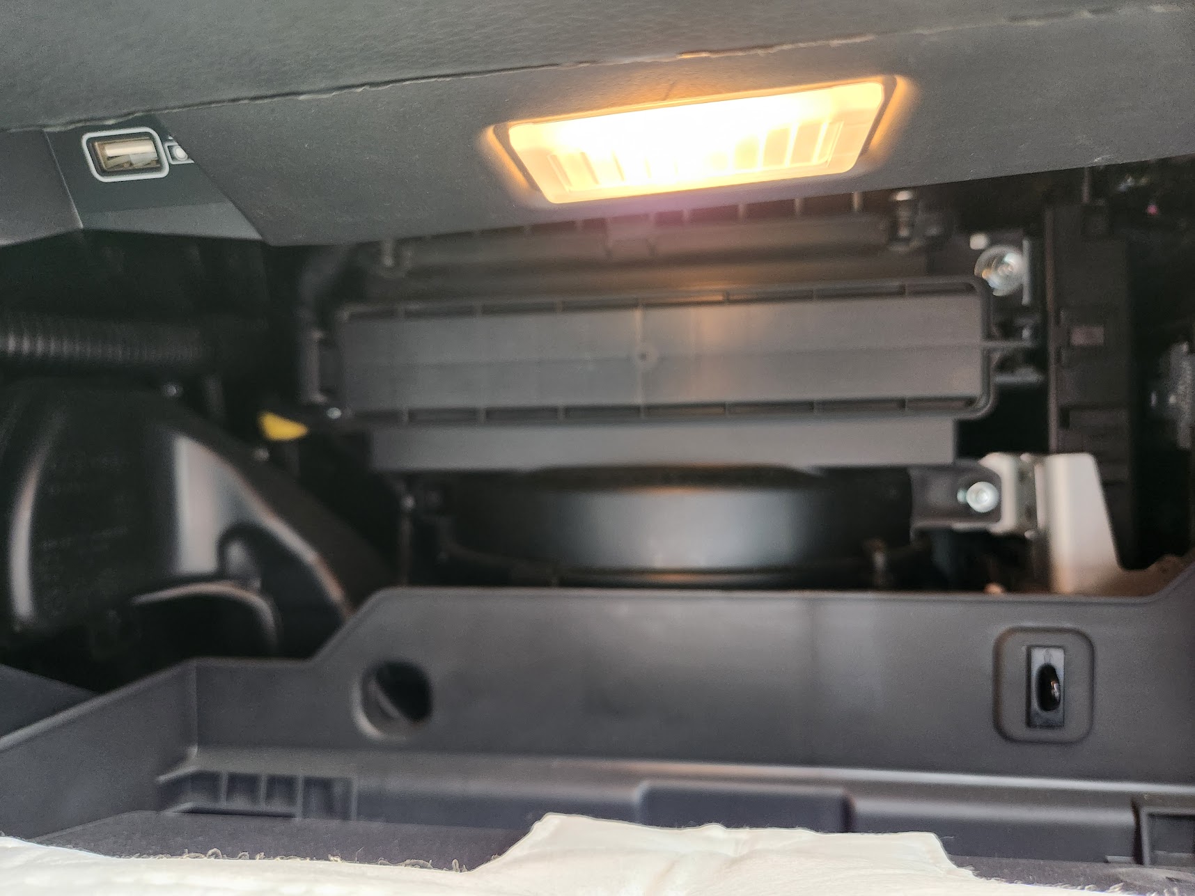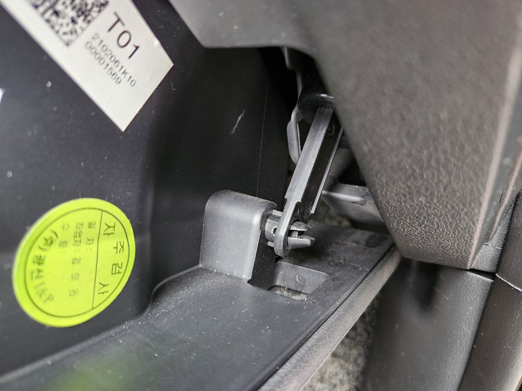 이렇게 하면 글로브박스가 아래로 젖혀지고 내부가 보입니다. 그러면 가로로 긴 플라스틱 커버가 달려 있는 것이 보이는데, 오른쪽에 손가락으로 잡고 누를 수 있는 부분이 있습니다. 이걸 손가락 두 개로 눌러서 빼낸 뒤 커버를 오른쪽으로 빼내주시면 됩니다. 왼쪽은 그냥 길게 튀어나온 부분으로 고정하게 되어 있어서 꽂을 때는 다시 여기에 꽂은 다음 핀(클램프)를 밀어 꽂으면 됩니다.