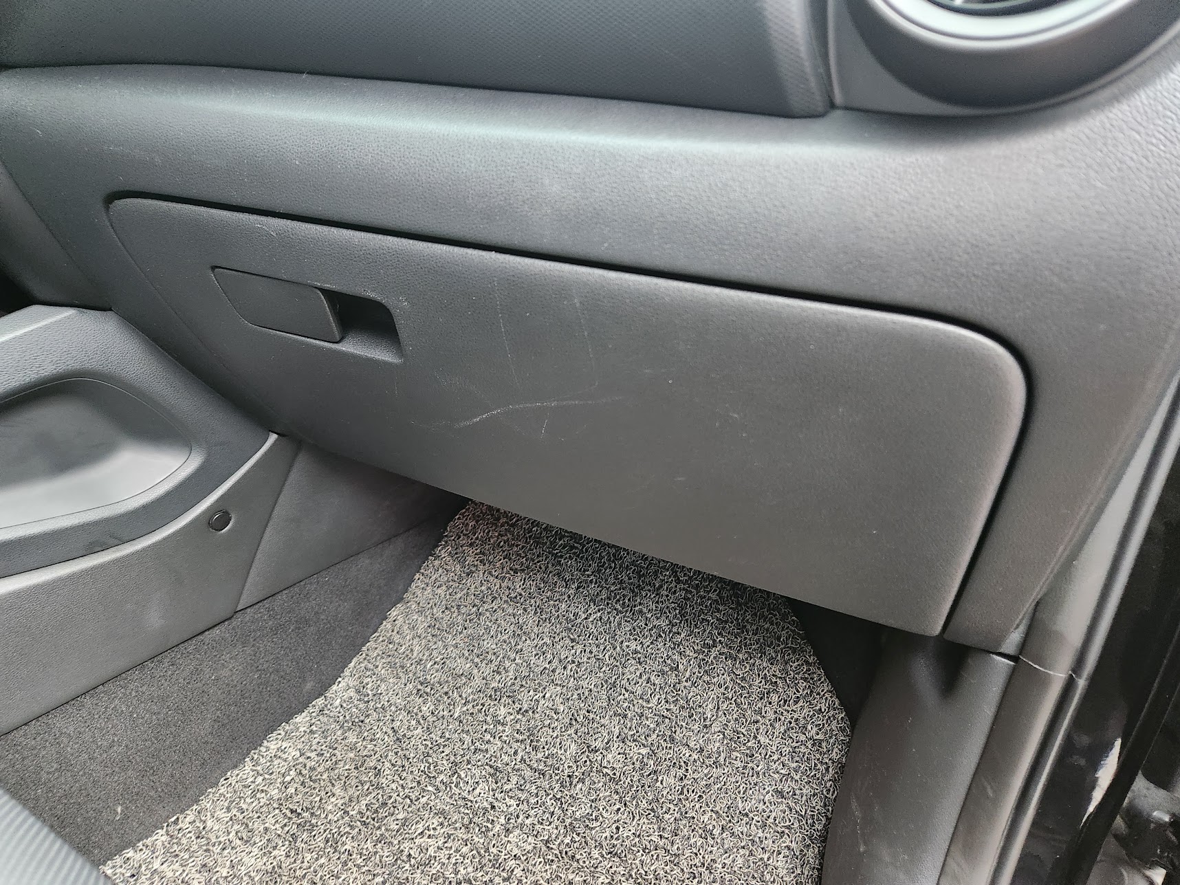 대부분 차량과 마찬가지로 코나 역시 에어컨 필터는 글로브박스 안쪽에 있습니다. 일단 글로브박스 안의 내용물은 전부 비우셔야 하는데, 글로브박스가 아래로 젖혀지기 때문입니다.