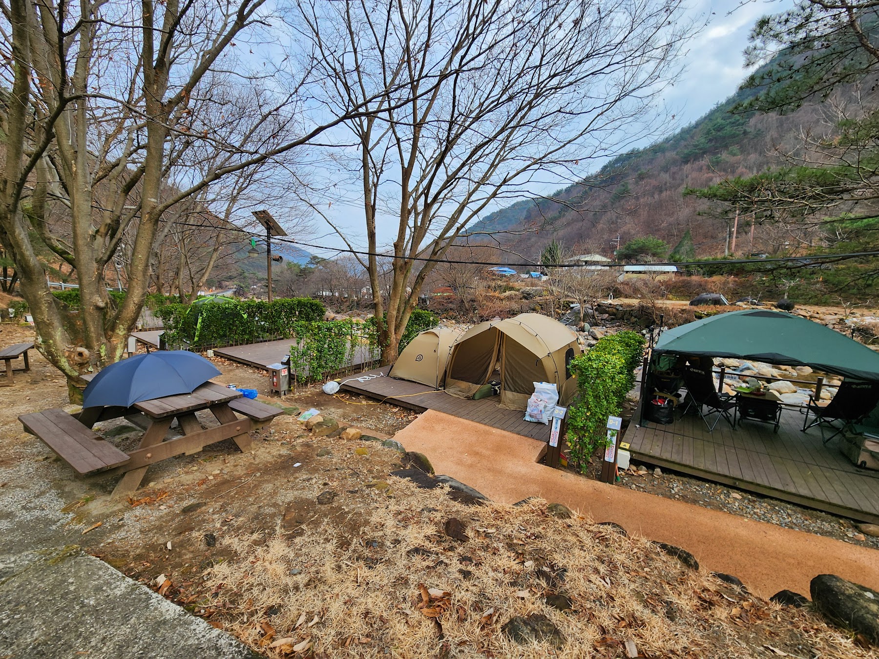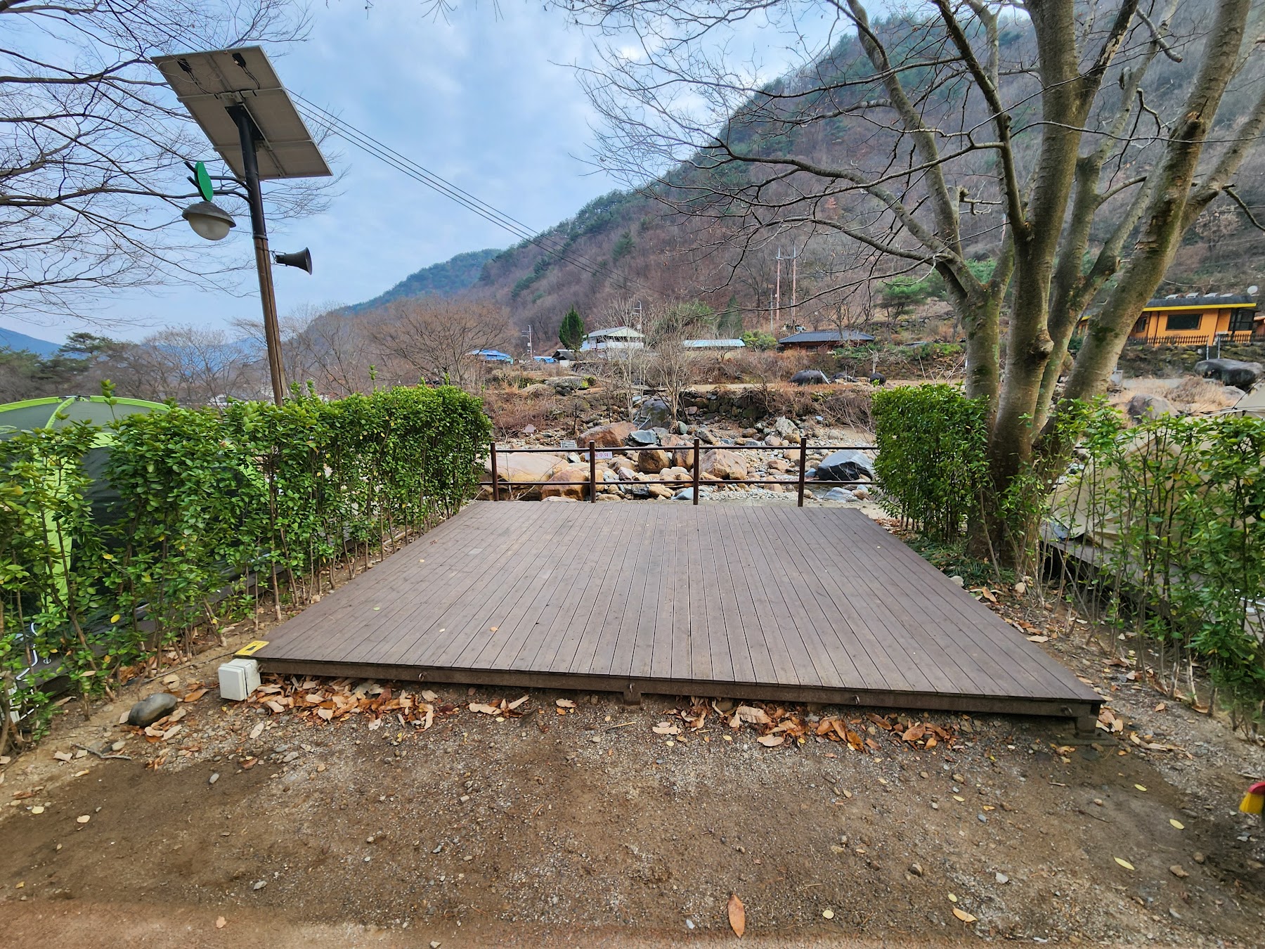 마지막으로 일반 영지인 D 영지로 갑니다. 이 D 영지는 그야말로 구석에 있어서 물을 쓰고 화장실을 가기는 가장 불편합니다. 물을 쓰는 것을 중요하게 생각하시는 분이라면 이 캠핑장은 정말 저주받은 캠핑장이다... 이 소리가 나올 것입니다. 하지만 그 점을 제외하면 영지가 나쁜건 아닌데, 전부 데크 영지라 냉기가 올라올 걱정, 평탄화 걱정은 일단 접어두셔도 좋습니다. 또한 모든 영지가 냇가 바로 옆에 있어서 물소리를 즐긴다면 정말 꿈같은 위치입니다. 전기는 데크에 바로 붙어 있어서 릴이 그렇게 길 필요도 없습니다.