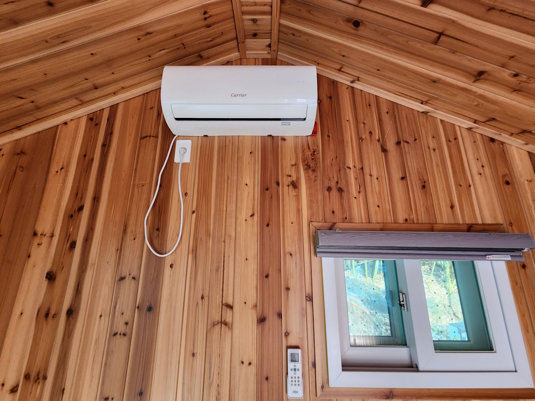 내부 공간은 A 영지의 산막텐트보다는 거의 1.5배 수준으로 넓습니다. 네 명이 자도 공간이 충분합니다. 커다란 거실문이 측면에 설치되어 있고 창문도 많아 통기성은 충분합니다. 당연히 에어컨은 벽걸이형으로 설치되어 있으며, 겨울에 필요한 난방은 바닥난방으로 되어 있습니다. 아무래도 방바닥은 따뜻하지만 침대에 익숙한 분은 여기에 이불을 바로 깔고 자면 허리가 좀 아플 수 있으니 이런 분들은 매트를 따로 가져 오시는 것도 방법은 될 것입니다. 저희도 이번에 에어매트를 갖고 갔구요.