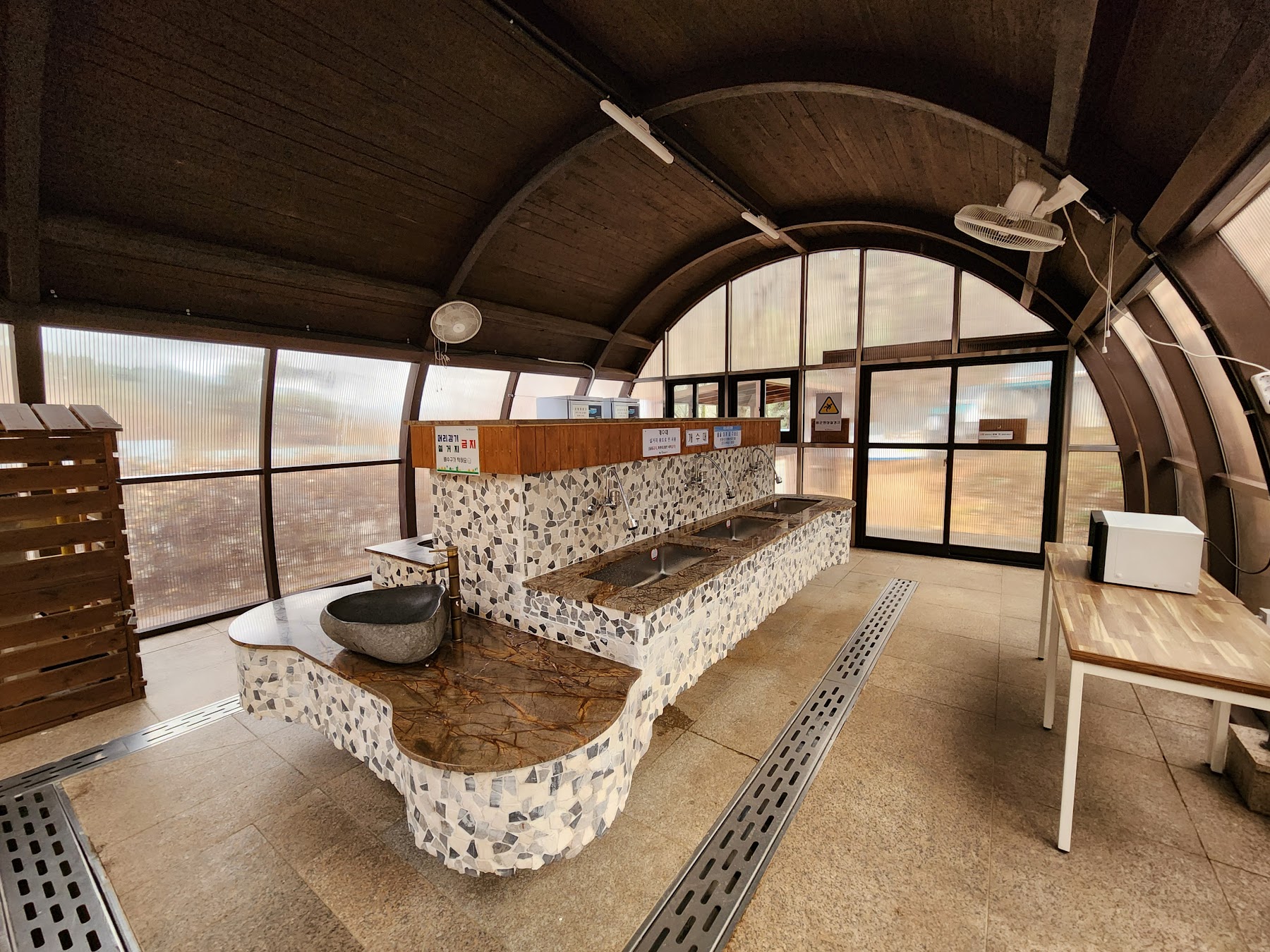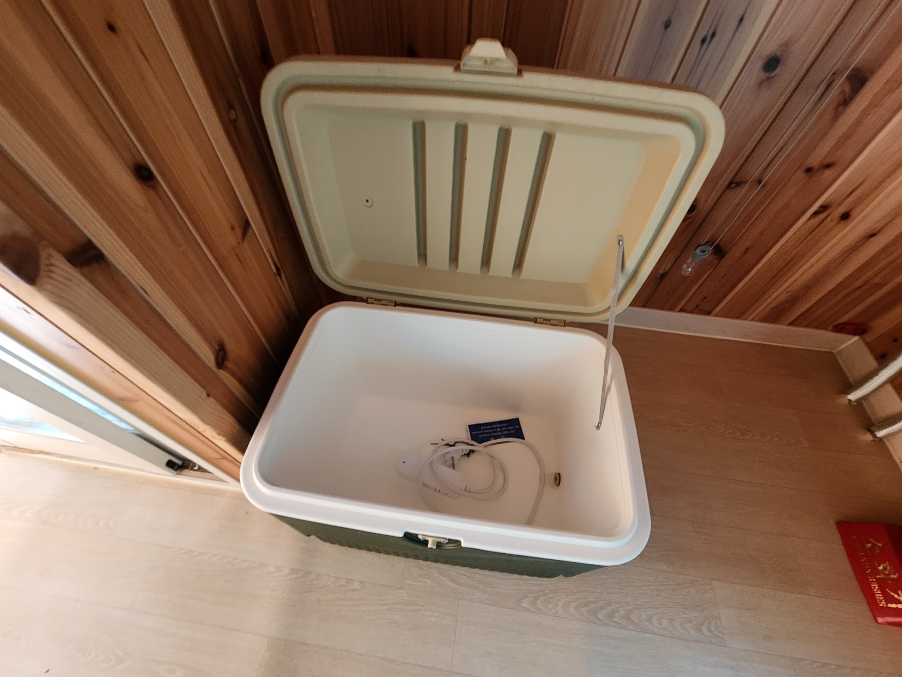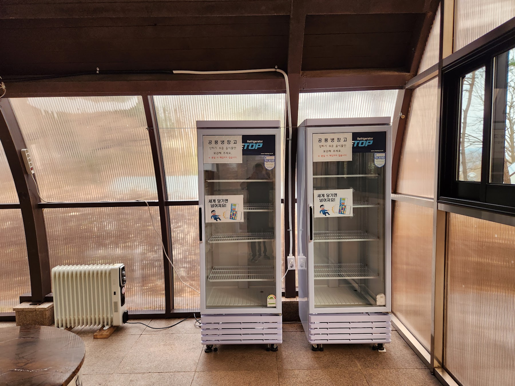 이왕 C 영지까지 온 김에 관련 시설을 D 영지 전에 먼저 소개합니다. 이 카라반이 있는 곳에 B/D 영지용 개수대, 화장실, 샤워장이 전부 몰려 있습니다. A 영지용 개수대는 조금 더 안쪽에 따로 있지만 A 영지도 아래쪽에 있는 곳들은 이 개수대를 이용합니다. 개수대는 실내 개수대 형태로서 개수대와 간이 세면대, 공용 냉장고 2대, 전자레인지 1대가 기본입니다. 여름을 대비한 선풍기 한 대, 겨울용 라디에이터 한 대가 있지만 이걸로 더위와 추위를 막는건 일단 무리입니다. 온수는 전기온수기를 이용하는데, 용량 문제가 있어서 시간대에 따라서 나오는 상황이 미묘합니다. 잘 나오면 뜨거운 물도 나오지만, 타이밍이 안 좋으면 그냥 손이 얼지 않는 것을 다행으로 여길 그런 물이 나옵니다. 손이 안 어는 것만 해도 어디냐 하시겠지만 말입니다. 샤워장은 어디든 마찬가지, 동전 시간식입니다.