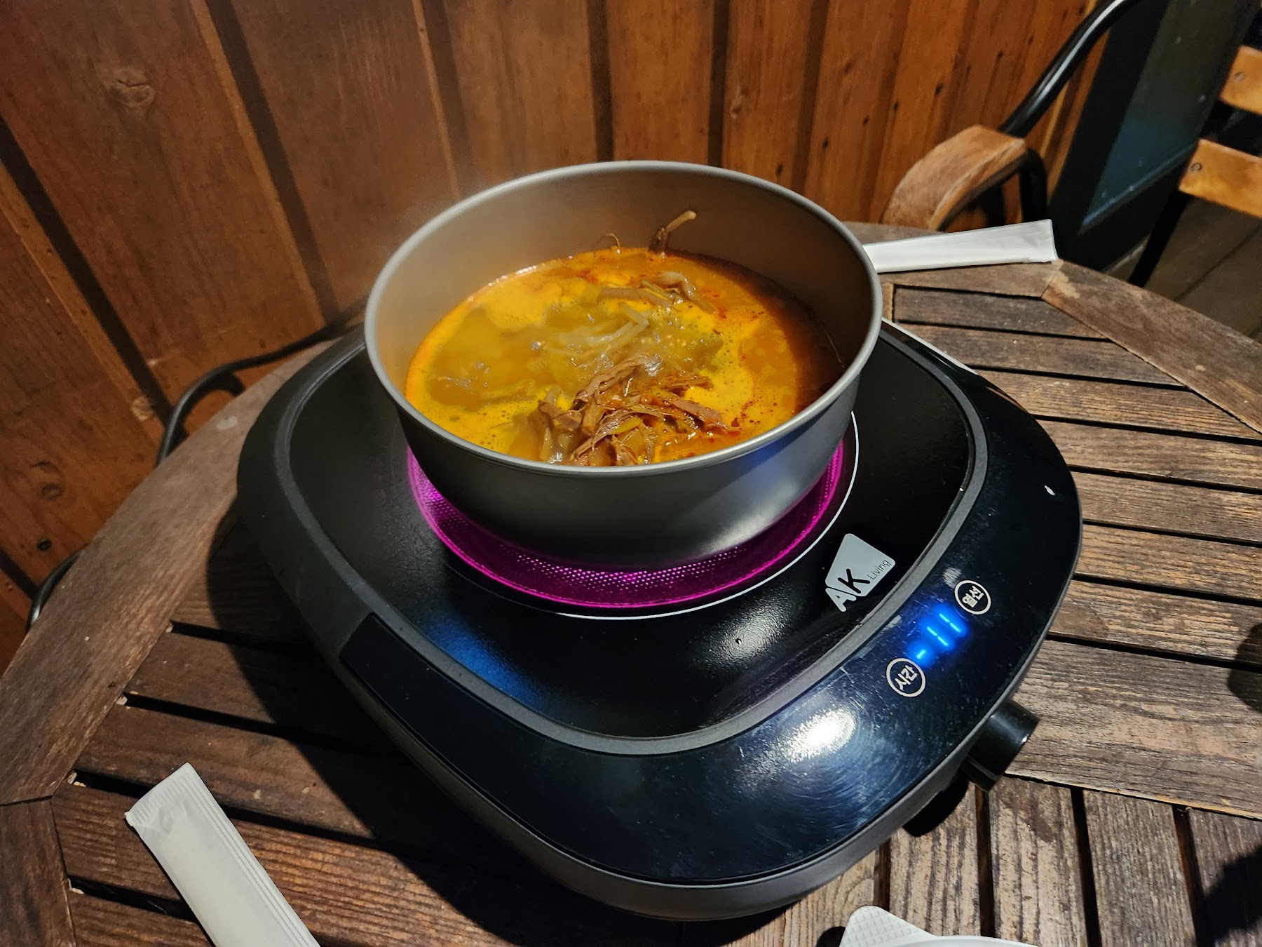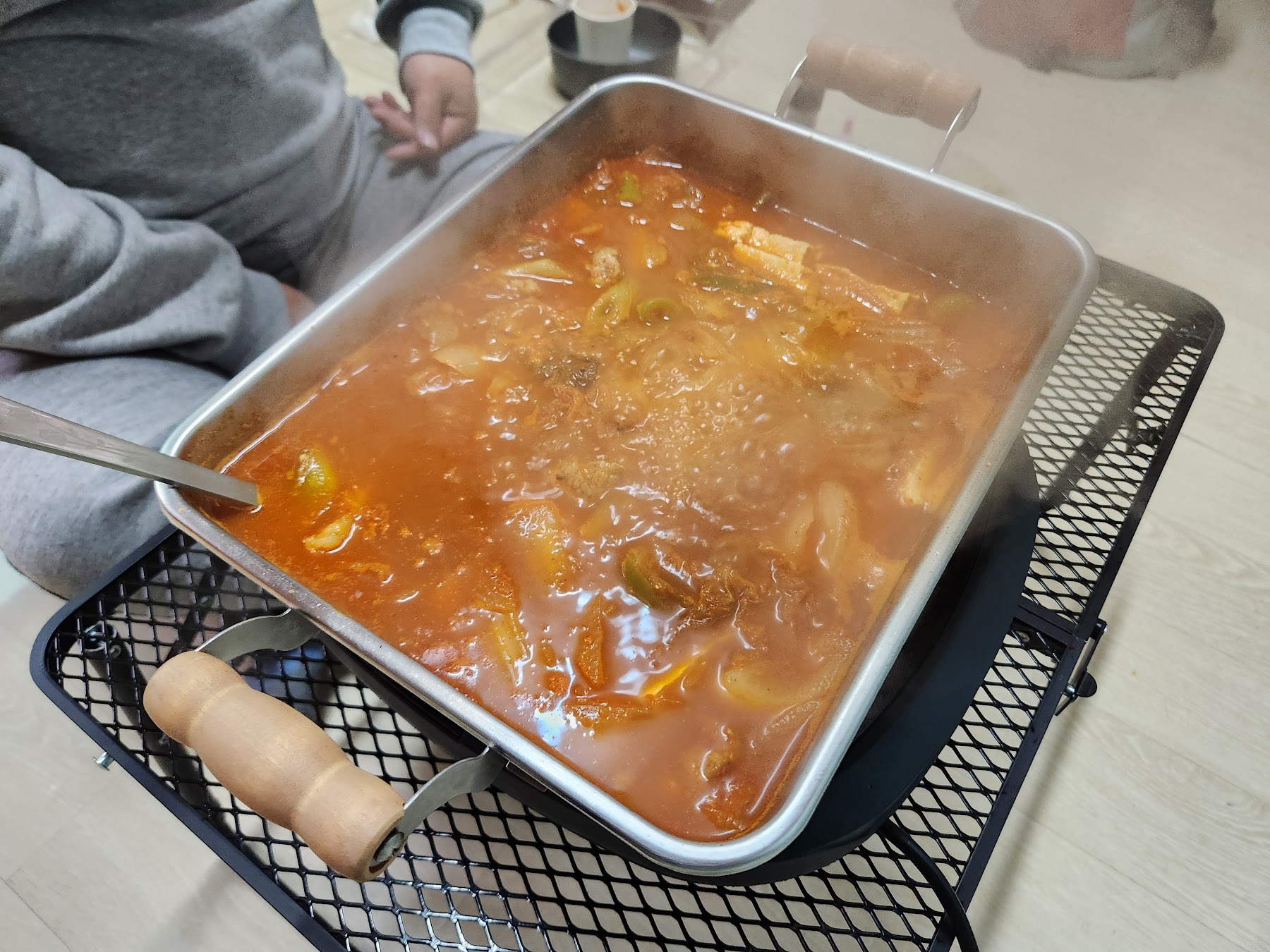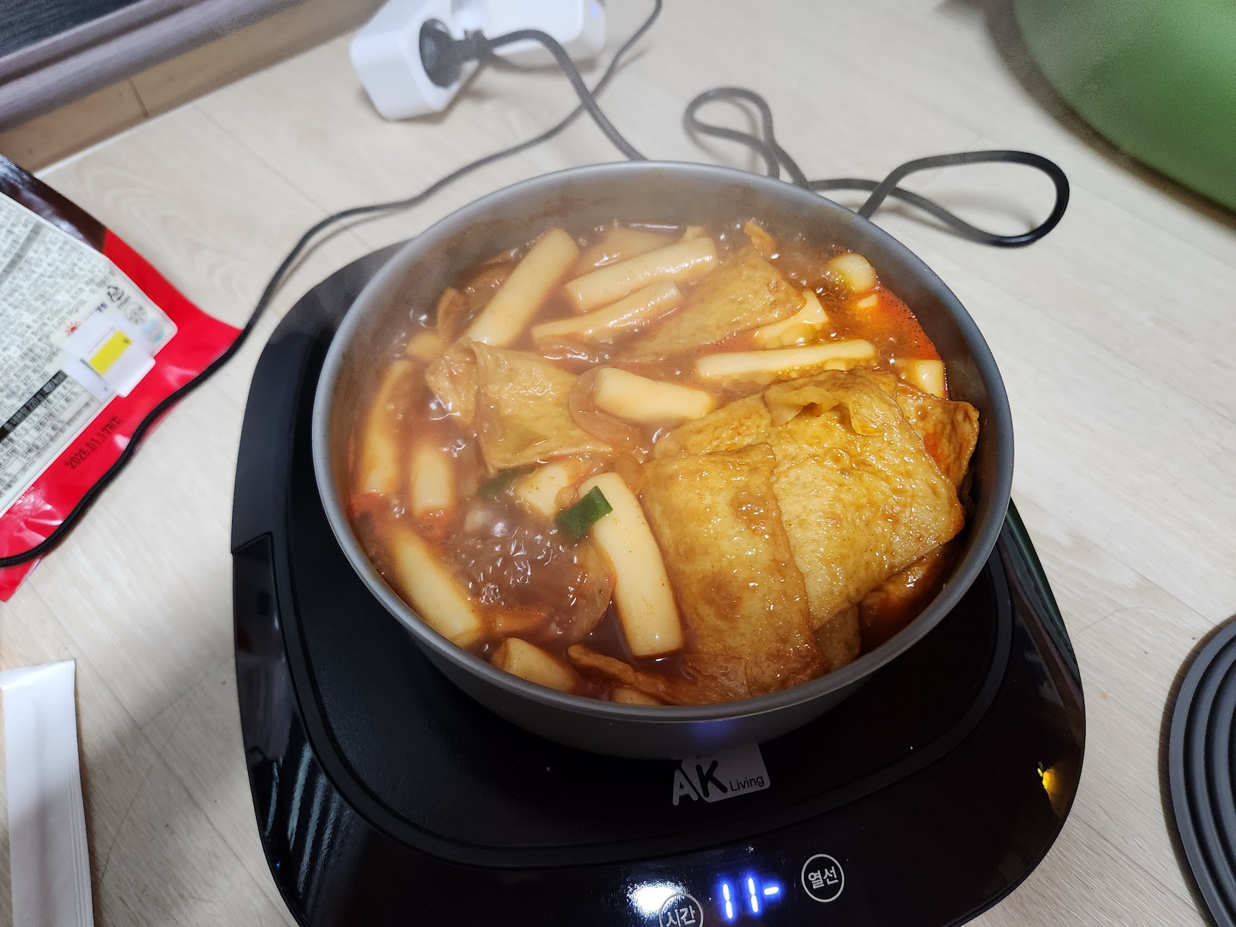 점심을 따로 먹지 않아서 잠자리 준비를 끝낸 즉시 간식 준비를 합니다. 이번 캠핑을 위해 준비한 새 장비가 동원되었는데, 바로 2,000W급 하이라이트입니다. 기존에 쓰던 900W급 핫플레이트는 전기 제한이 1,500W급 이하인 곳에서 쓸 목적으로 준비해둔 것이지만 화력 부족은 어쩔 수 없었습니다. 하지만 이번같은 하우스에서는 전기 걱정이 없으니 그냥 이런걸 동원할 수 있는데, 동계에 화력이 불안정한 가스에 비해 실내에서도, 실외에서도 안정적인 화력을 보여줍니다. 화력을 절반씩 개별 조정이 가능하여 전기 제한이 좀 있는 곳에서도 못 쓰는 것도 아니구요. 이걸로 싸구려 신당동식 떡볶이를 끓입니다. 그냥 싸구려지만 맛은 그냥 그런대로 나쁘지 않더군요.