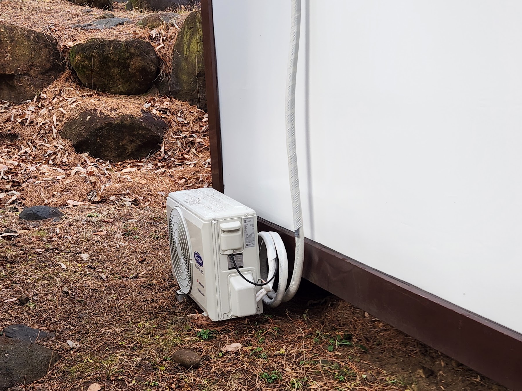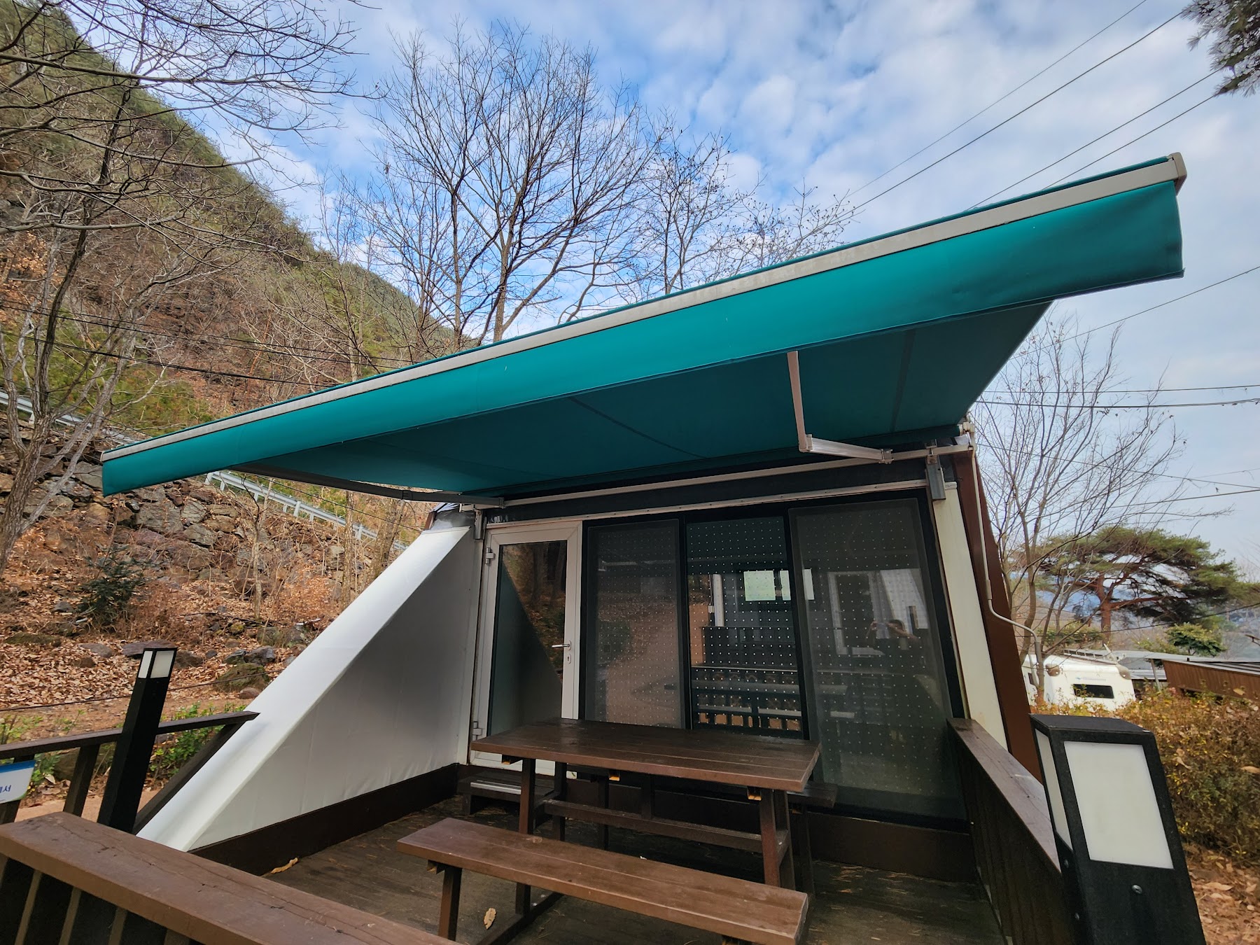 그렇지만 이 때와 한 가지 달라진 것이 있으니, 바로 '에어컨'입니다. 위의 포스팅을 할 때만 해도 이동식 에어컨을 달아 놓았던 산막텐트가 전부 제대로 된 벽걸이형 에어컨을 달아 놓았습니다. 좁은 것만 좀 감안하면 이제 여름에도 더위 걱정은 전혀 없는 캠핑이 가능한 것입니다. 바깥에는 접이식 차양막(어닝)이 되어 있고 데크 위에 나무 테이블이 있으니 여름에도 폭우만 안 내리면 최소한 밖에서 뭘 해먹을 수는 있습니다.