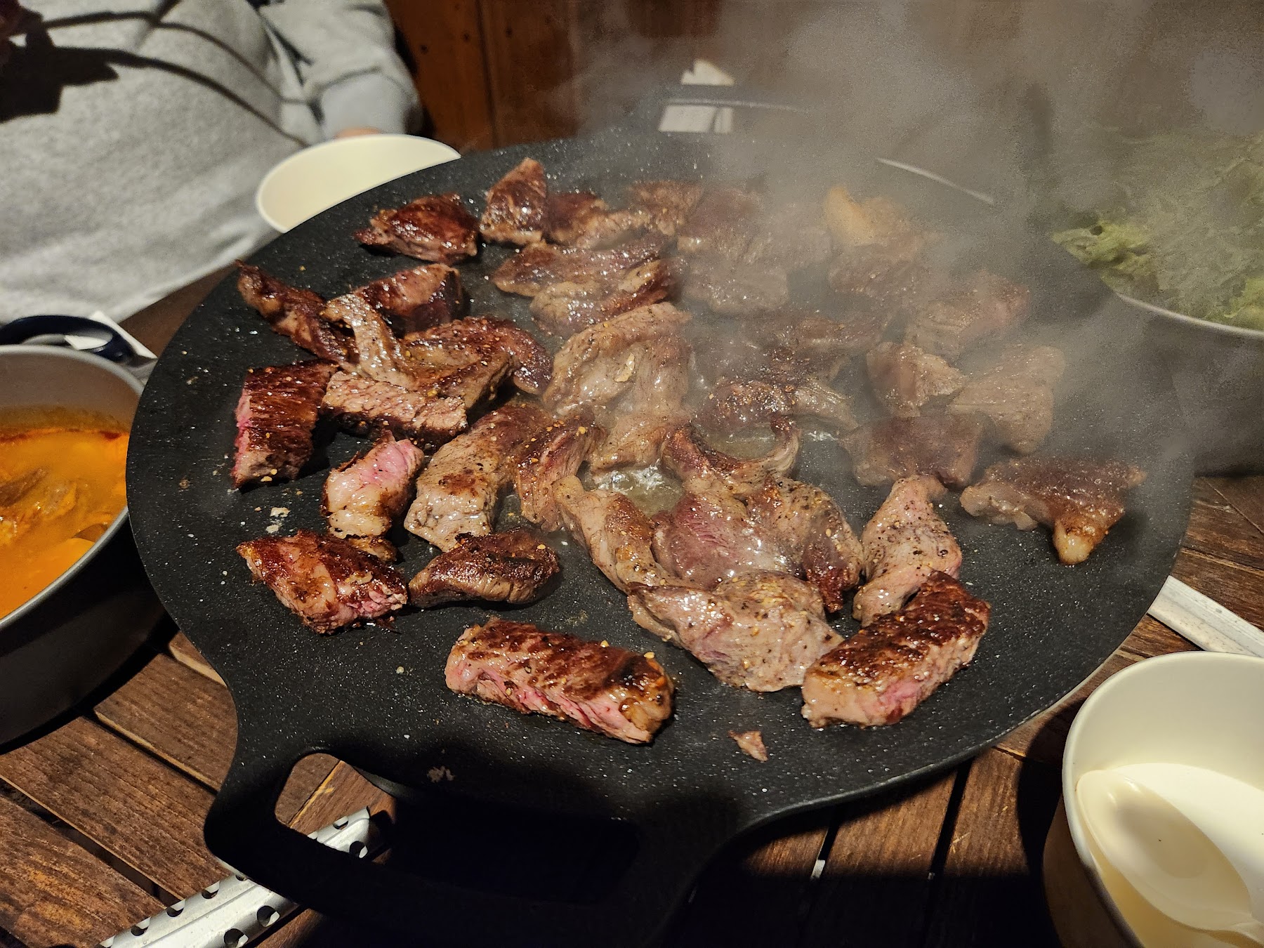 사실 끝까지 고민을 했으나 아무도 다른 대안이 없었다는 이유로 저녁 메뉴는 그냥 고기가 되었습니다. 마침 서울 마트에서 고오급 호주산 쇠고기 세일을 하여 등심과 갈비살을 적당히 사들고 와 하이라이트로 굽습니다. 정말 화력 끝내주더군요. 고기가 정말 잘 익는데, 이 계절에는 화력 부족에 고기가 좀 겉이 약하게 익는 것이 불만이었는데, 겉이 제대로 구워지고 속은 적당히 익은 고기는 지역 상추와 깻잎에 싸서 쓱쓱 사라집니다. 탄수화물 하나 안 들어간 고기고기고기 파티를 잘 벌였습니다.