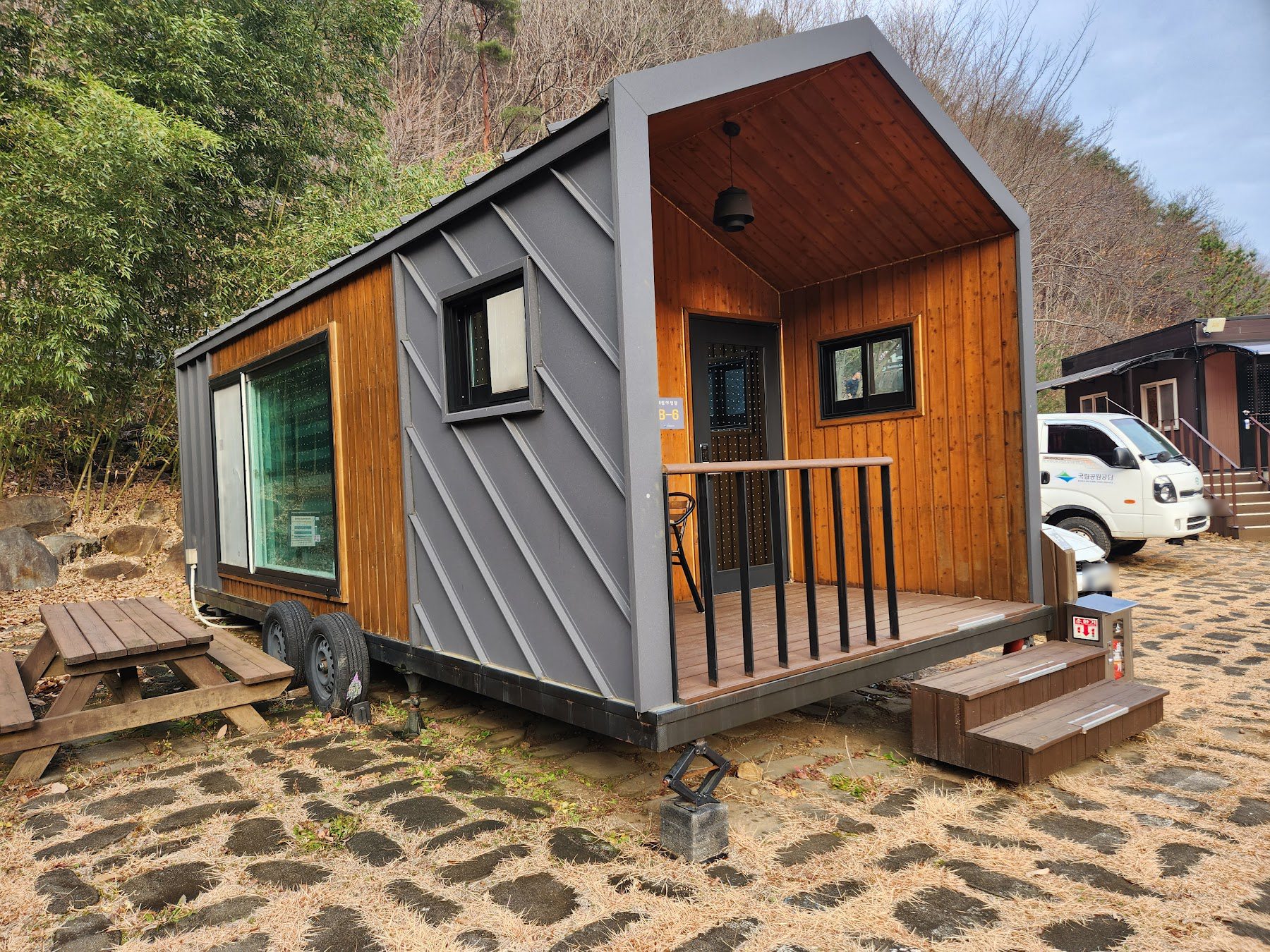 1년 전과 마찬가지로 오늘 다시 온 B 영지, 즉 하우스는 A 영지와 다르게 제대로 된 나무 구조 하우스입니다. 4인용 나무 테이블이 제공되는 A 영지와 달리 하우스 문 앞에는 2인용 라운드 테이블이 설치되어 있습니다. 4인용 나무 테이블은 하우스 옆면에 사실상 방치 모드(?)로 있습니다. 4명 가족이 무언가 해먹어야 한다면 저 나무 테이블을 이용해야 하지만, 두 분만 온 경우 라운드 테이블을 이용하는게 편합니다. 조명도 없는 나무 테이블보다 조명도 있어서 불편하지 않고, 전기도 쓸 수 있기 때문입니다.