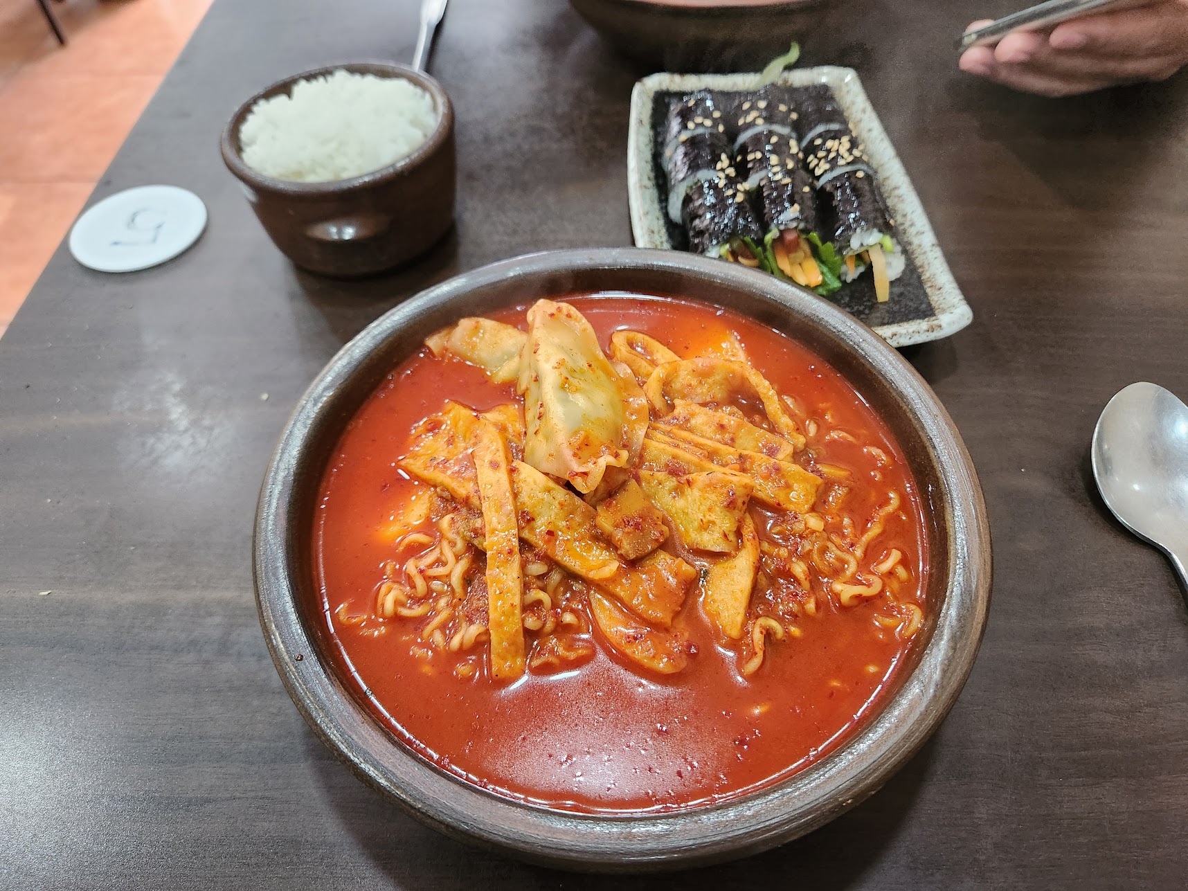 라면 이외에는 공기밥과 김밥 주문이 가능합니다. 김밥은 손말이 스타일의 미니김밥이며, 이걸 젓가락으로 집어 먹을 수 있게 세토막을 내서 나옵니다. 개당 1,000원이라서 그냥 배 사정에 맞춰 적절히 주문하면 되니 이것도 나름 가성비가 괜찮습니다. 스팸과 참치김밥의 두 가지 가운데 선택이 가능합니다. 공기밥은 물동밥이라고 이름이 붙는데, 그 이유는 항아리 모양의 물컵에 밥을 담아주기 때문입니다. 일반 공기밥 양의 2/3 정도가 되는데, 가격이 눈물나게 착한 500원입니다.T_T