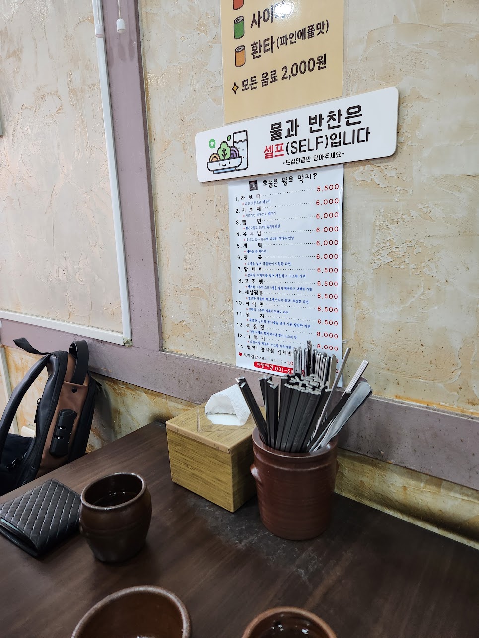 외형에서도 알 수 있듯이 큰 곳은 아닙니다. 테이블 6개 정도로 작은 곳이라 정말 피크 시간에는 좀 기다려야 하는 일도 벌어지니 미리 참고를 당부드리며... 그냥 작은 분식집이지만, 의자에 앉아 메뉴판을 보면 벌써부터 범상치 않음을 느낄 수 있게 됩니다. 라면 이름이 일반적인 그런 이름이 아닙니다. 물론 중2병같은 이름은 아니고, 라면의 특징을 최대한 줄여서 표현한 것들입니다.