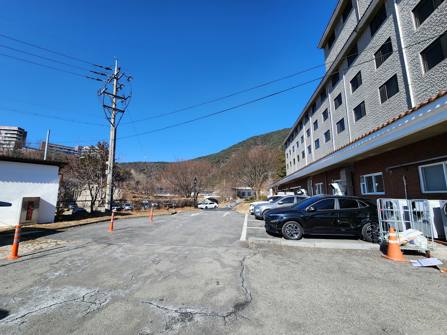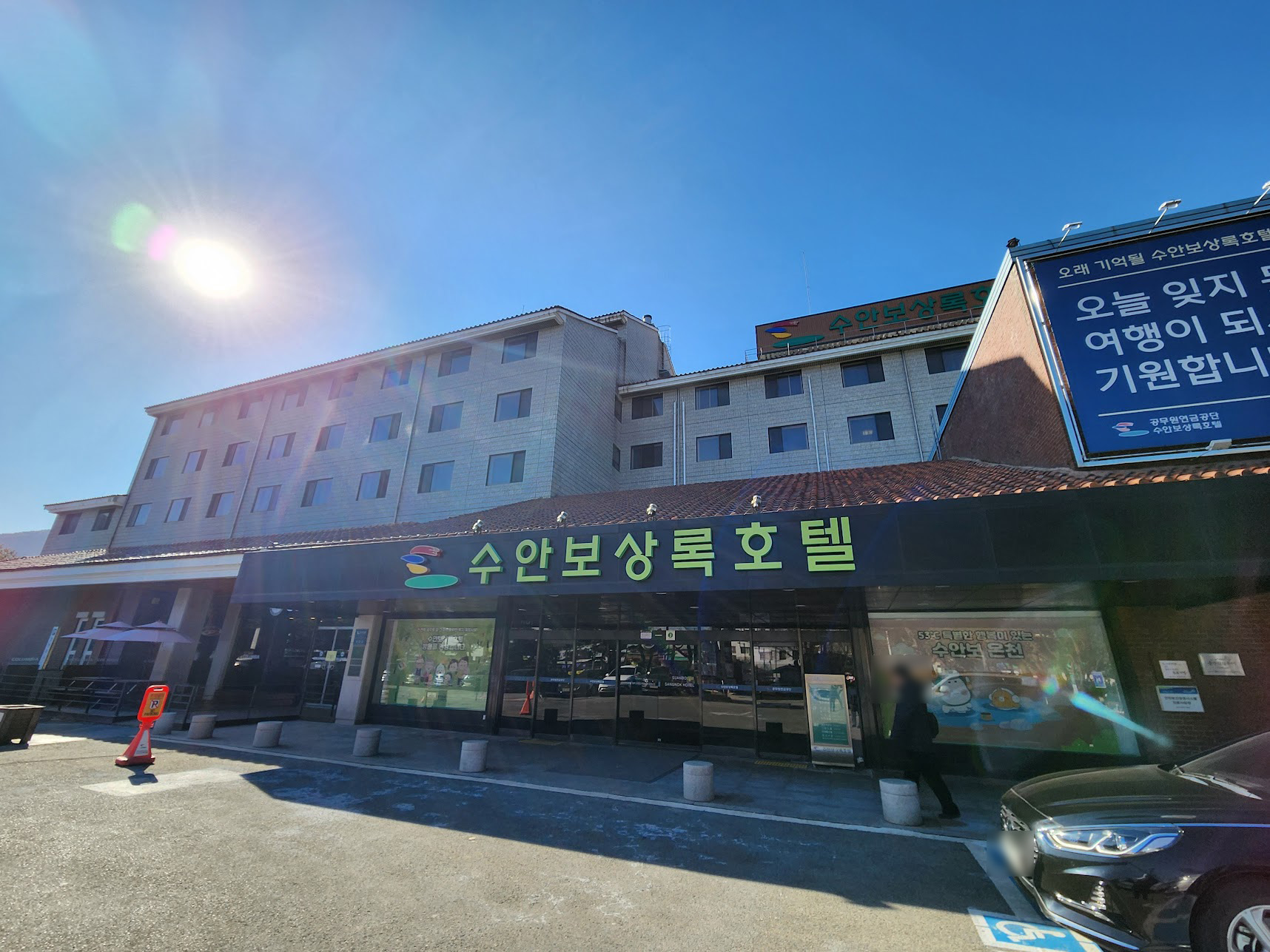 호텔은 5층 규모의 아담한 크기이며, 주차장은 전부 지상 주차장입니다. 호텔 앞 말고도 뒷쪽으로도 주차장이 따로 있는데, 이론적으로 면수는 충분한데 지금이 온천의 성수기라서 온천만 오는 사람들까지 고려하면 주차장이 매우 여유롭지는 않아서 좋은 자리에 주차하는 것 까지는 기대하기가 조금 어렵습니다. 약간 걸어야 할 수 있다는 점을 생각하고 주차하셔야 합니다.