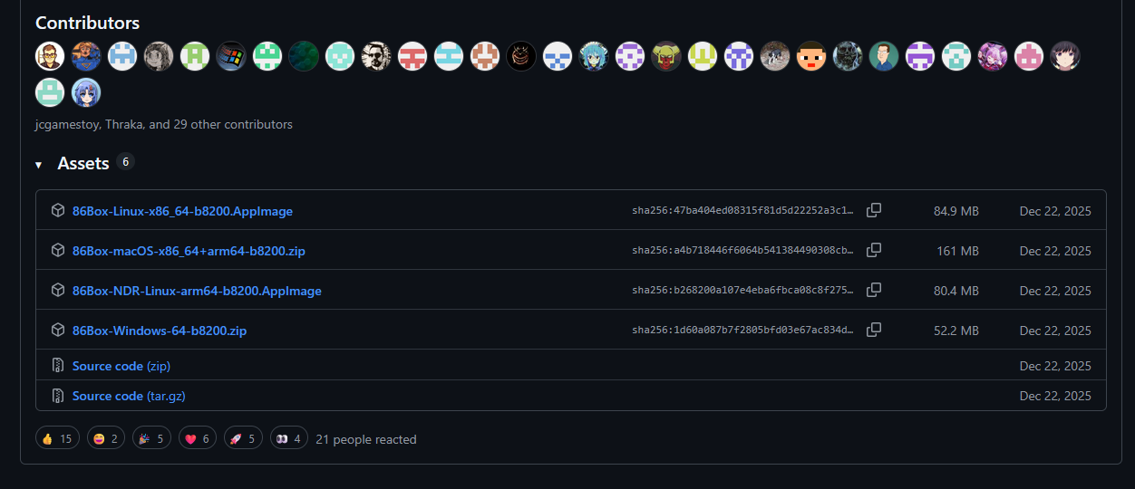 일단 86Box 본체는 공식 사이트(www.86box.net)에서 구할 수 있습니다. 최신 버전은 5.3이며, 'Download Stable'을 골라 Github 사이트로 넘어가면 가장 아래에 다운로드 링크가 있습니다. 윈도우(x64 전용), macOS, 리눅스용이 있고, 여기서는 윈도우용을 다운로드합니다. 설치 프로그램은 별도로 없고, 그냥 원하는 곳에 압축을 풀면 됩니다. 다만 한글이나 한자, 일본어 등 알파벳 이외의 문제 또는 특수문자가 들어간 경로에 두면 안 되기에 이것만 주의를 당부드리며... 아래 링크가 공식 페이지 되겠습니다.