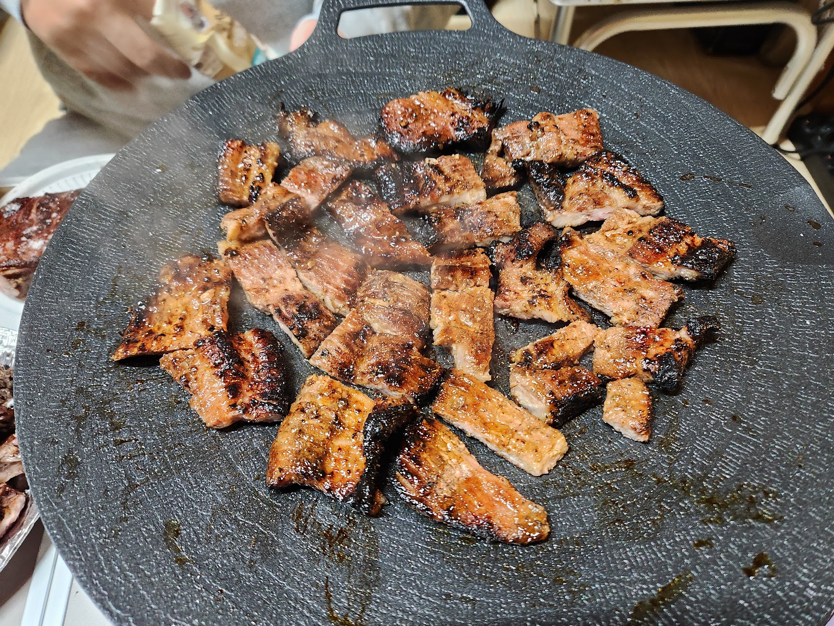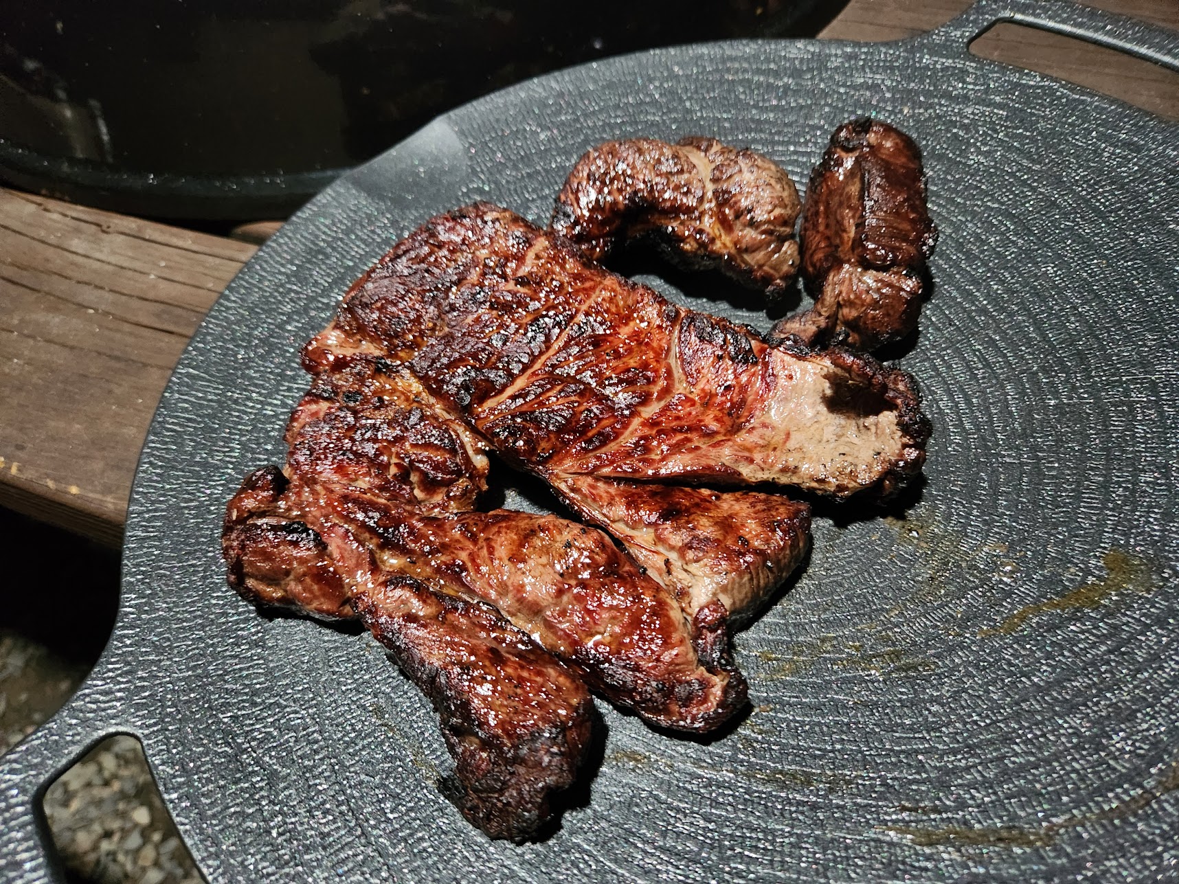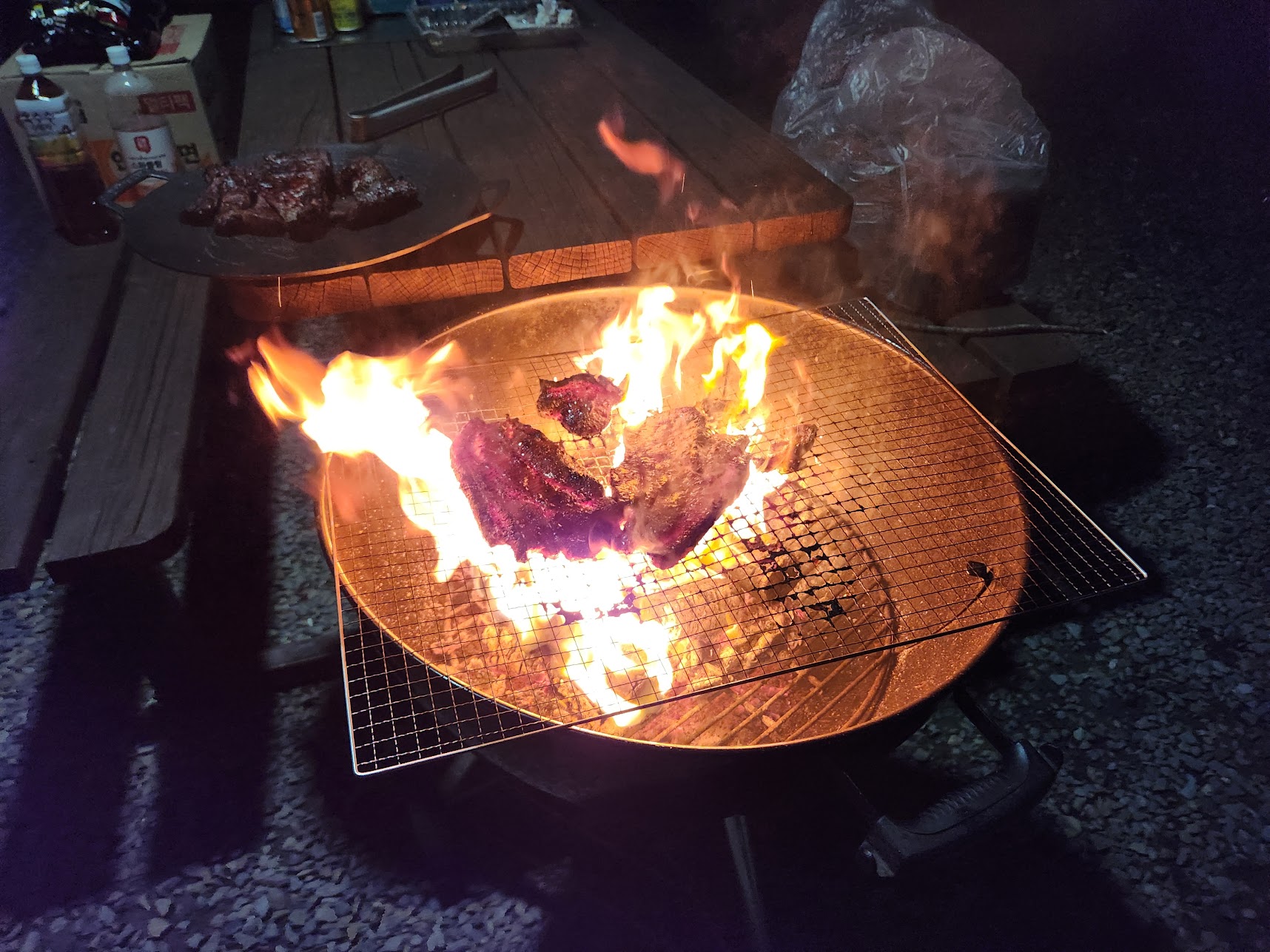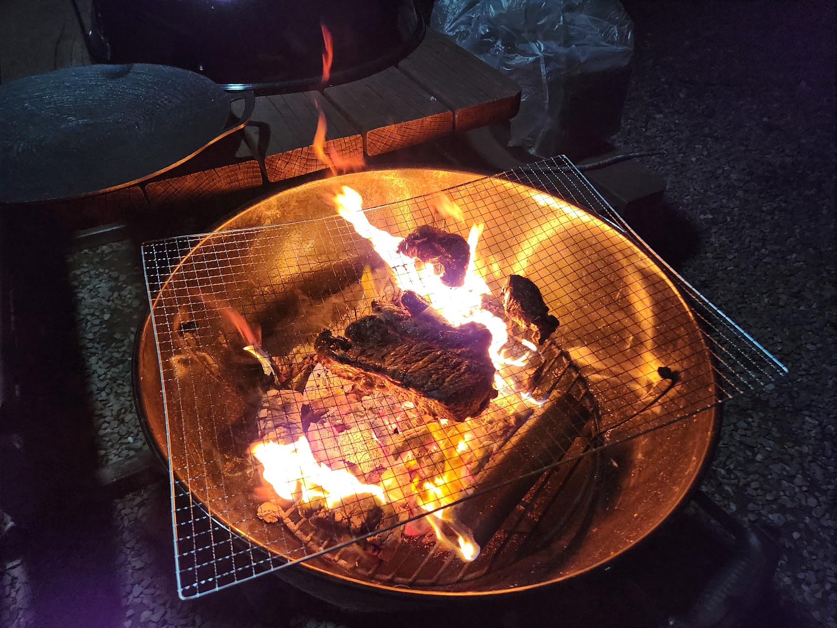 이렇게 초벌로 구운 고기를 최대 파워로 높인 하이라이트 위 그리들에 올려 마무리 구이를 마칩니다. 미디엄 스테이크는 역시 우리나라 사람 입맛에는 좀 덜 익숙하다는 이유로 웰던으로 추가로 굽고, 양념구이는 그냥 열만 더 가하는 정도로 마무리를 지었습니다. 맛은... 쇠고기는 그야말로 미국식 스테이크 그 자체. 그냥 거기에서 더 나을 것도, 못할 것도 없습니다. 하지만 기대를 안 한 싸구려 돼지 양념구이는 그야말로 마포 돼지갈비집 못지 않은 맛이 나와서 그걸로 밥을 다 비웠습니다. 다음에 화로대에 고기를 구울 때는 양념구이를 애용해야지... 이렇게 또 하나의 경험치를 쌓았습니다.^^