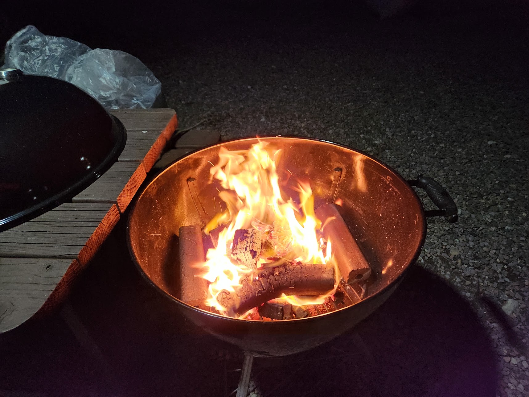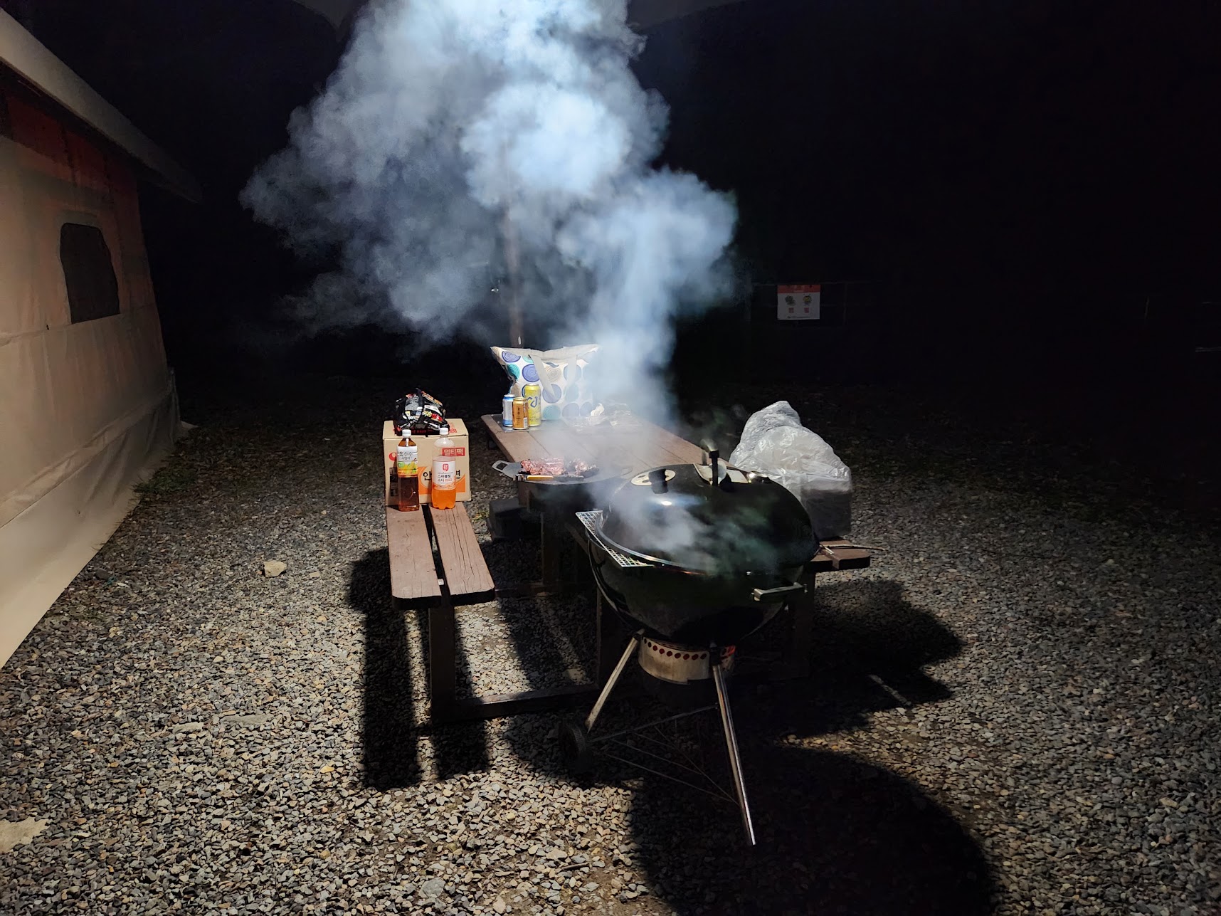 그렇게 6시쯤 되었을 때 일찍 밥을 먹자는 결론을 내리고 밥을 짓고 화로대에 불을 피우기 시작했습니다. 모든 것은 최소한 플랜 B까지는 생각하고 준비해 오지만 훌륭한 화로대가 있는데 안 쓰는 것도 아깝죠. 그래서 더 추워지기 전에 고기를 굽자고 하고 바깥에서 숯불로 초벌구이를 하고 전실에서 가볍게 데워 마무리를 하는 것으로 하였습니다.