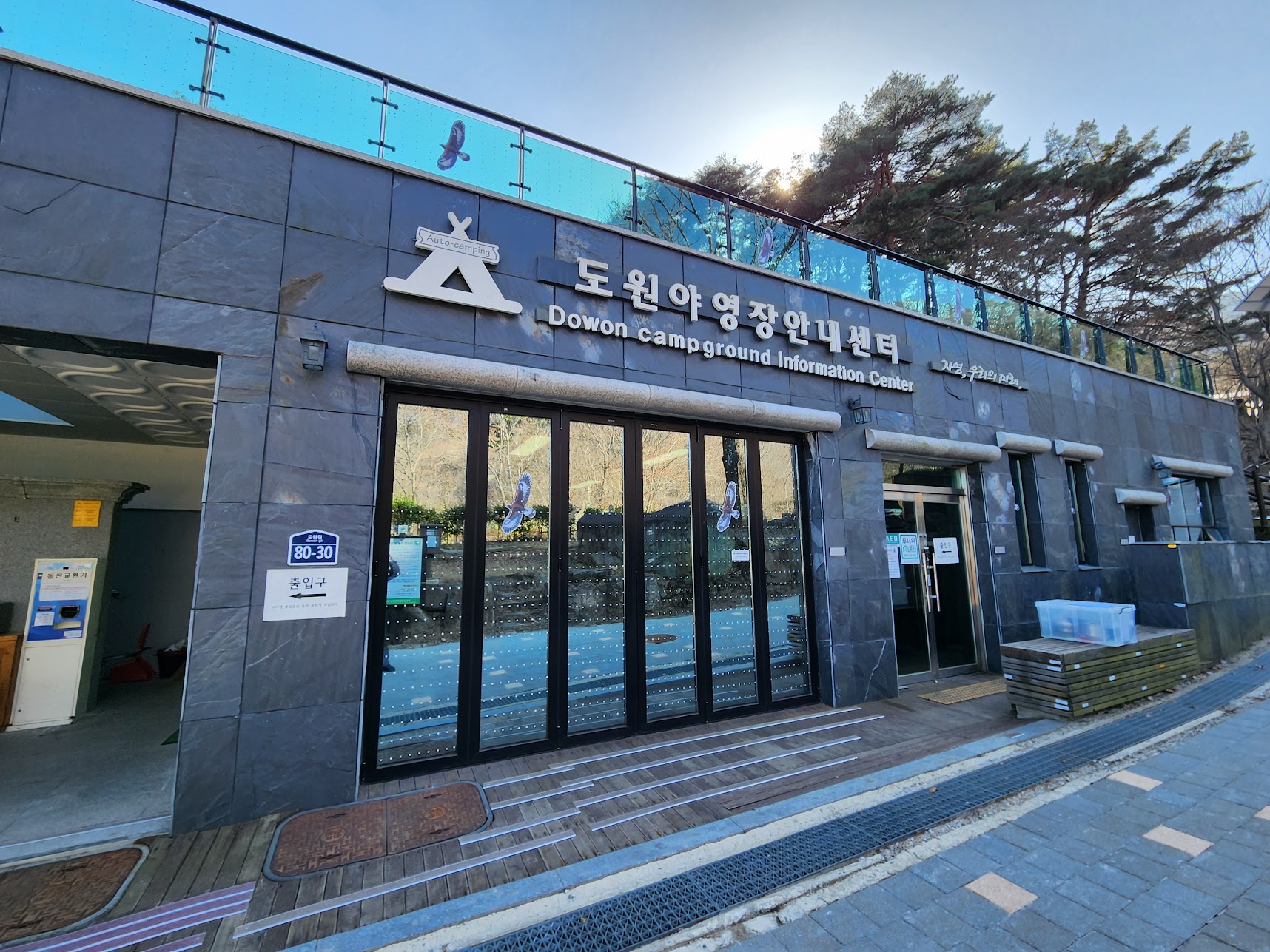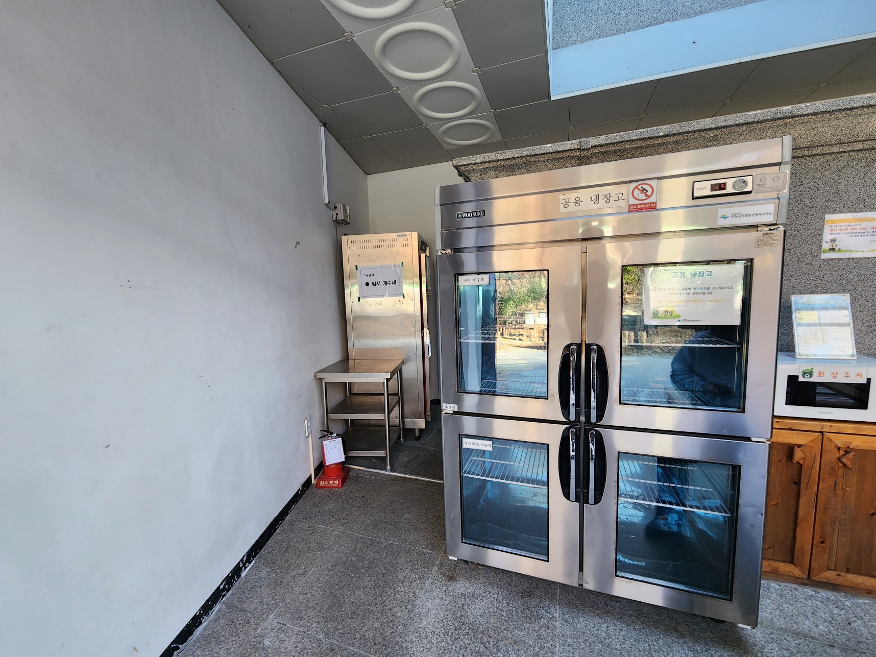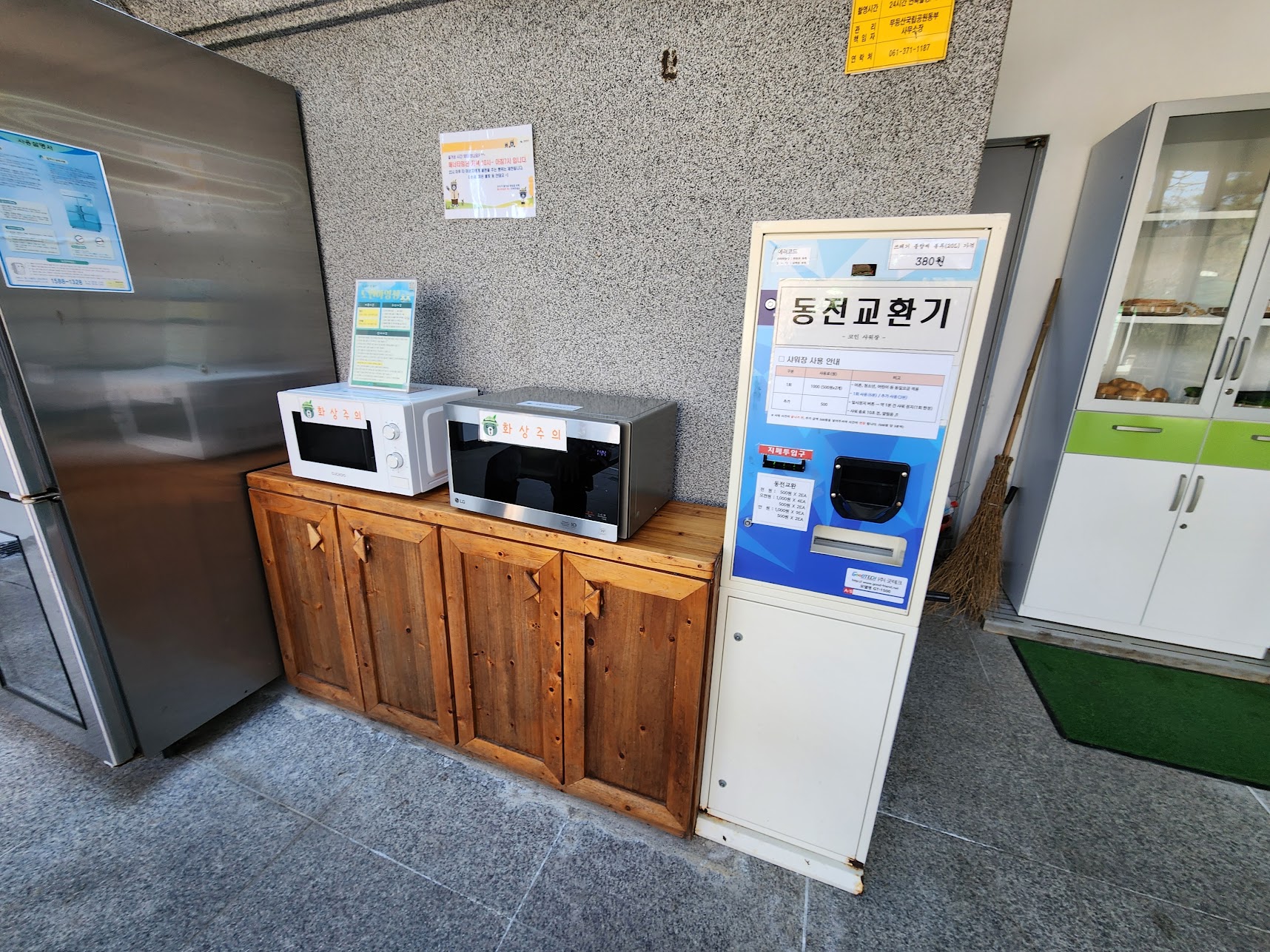 이렇게 중간의 관리사무소에 왔습니다. 체크인은 비대면으로 가능하지만 여기에 한 번 와야 하는 이유는 쓰레기봉투를 사야 하기 때문입니다. 화순군 쓰레기봉투를 갖고 계시면 상관은 없지만 화순읍을 들려서 오신게 아니면 그럴 가능성은 낮으니 보통은 들려야 하는 곳입니다. 이 때 십원짜리를 가져 오시면 좋은데, 쓰레기봉투 가격(380원)은 현금으로만 받기 때문입니다. 남은 10원과 50원을 잘 활용하면 참 좋습니다. 관리사무소 앞에는 공용 냉장고와 전자레인지가 있어 캠핑의 음식 보관과 식사 메뉴의 폭을 늘리는 데 도움을 줍니다. 샤워장은 관리사무소 옆에 있는데, 동전식이라 동전교환기도 여기 있습니다.