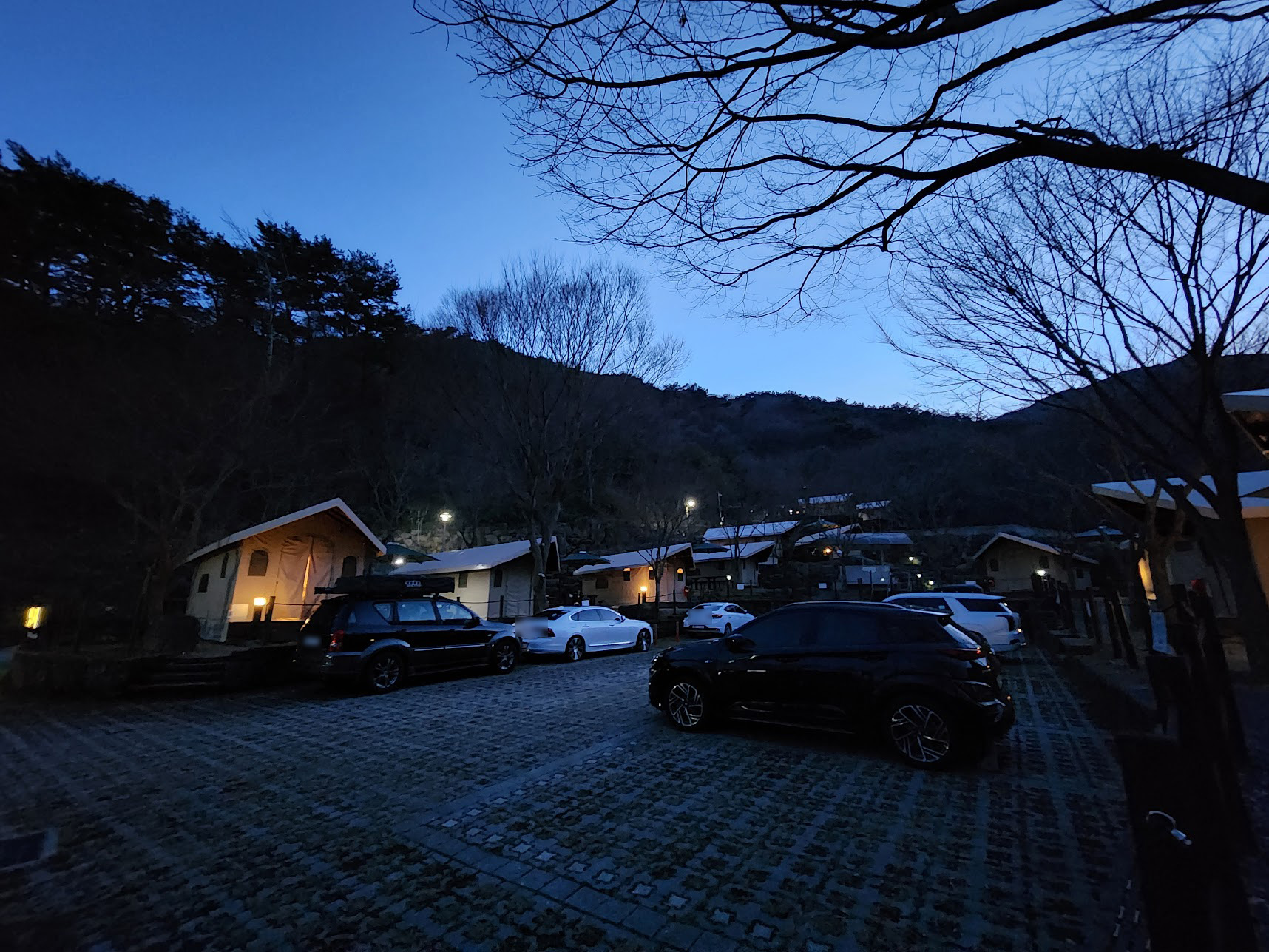 이 캠핑장은 일반 영지와 산막 텐트의 수가 엇비슷할 정도로 나름 특성화 캠핑장입니다. 3동(예비 포함)을 제외한 나머지가 한 층에 몰려 있고, 가운데에 주차장이 배치되어 있습니다. 가까운 곳에 적당히 차를 댄 뒤 짐을 옮기면 됩니다. 아직 올해 운영 초창기인데다 주말 날씨가 추워진다는 소식 때문인지 절반 정도의 영지만 찼습니다.