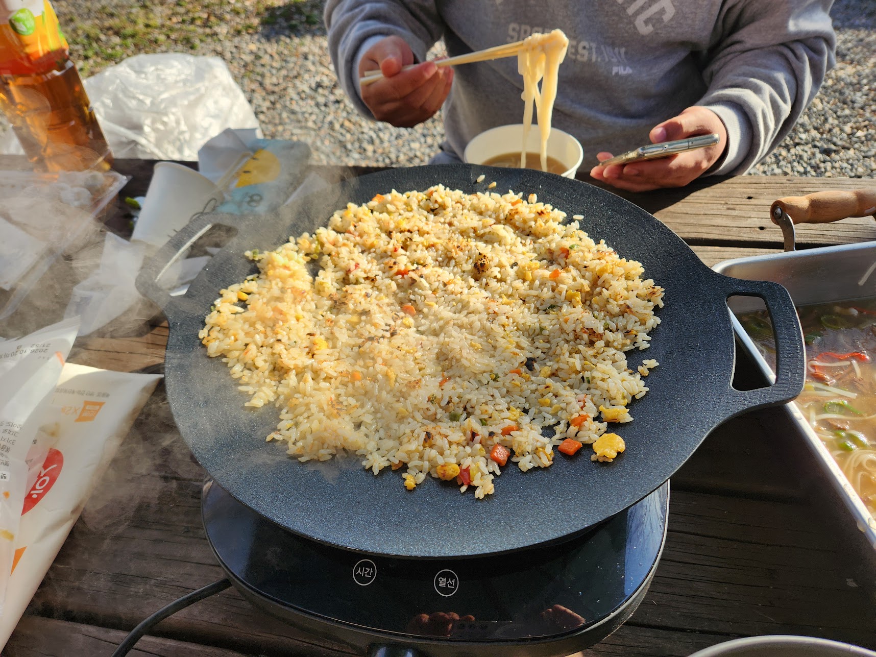 날씨가 조금 추웠기에 이 날 아침은 쌀국수에 볶음밥을 골랐습니다. 쌀국수는 1인분 단위로 포장된 냉동을 골랐는데, 여기에서 문제가 벌어집니다. 국수를 2분 30초동안 삶으라 하였으나 이걸 찬물에 씻어내야 하는데, 바로 옆에 있는 개수대를 쓰지 못하니 열심히 넘치지 않게 냄비를 들고 깔끄막을 내려가야 했습니다. 그 사이에 쌀국수가 너무 익어서 불어버렸습니다. T_T 그나마 쌀국수는 고기도 꽤 들어서 국물은 괜찮았지만 면의 탄력이 죽어서 제 뱃속으로 대부분 들어갔습니다. 반대로 최대 화력으로 볶은 계란볶음밥은 두 번 뒤집기만 했어도 누룽지처럼 바삭하여 입 속을 즐겁게 만들었습니다.