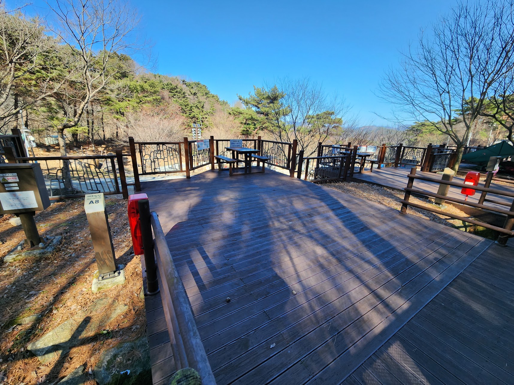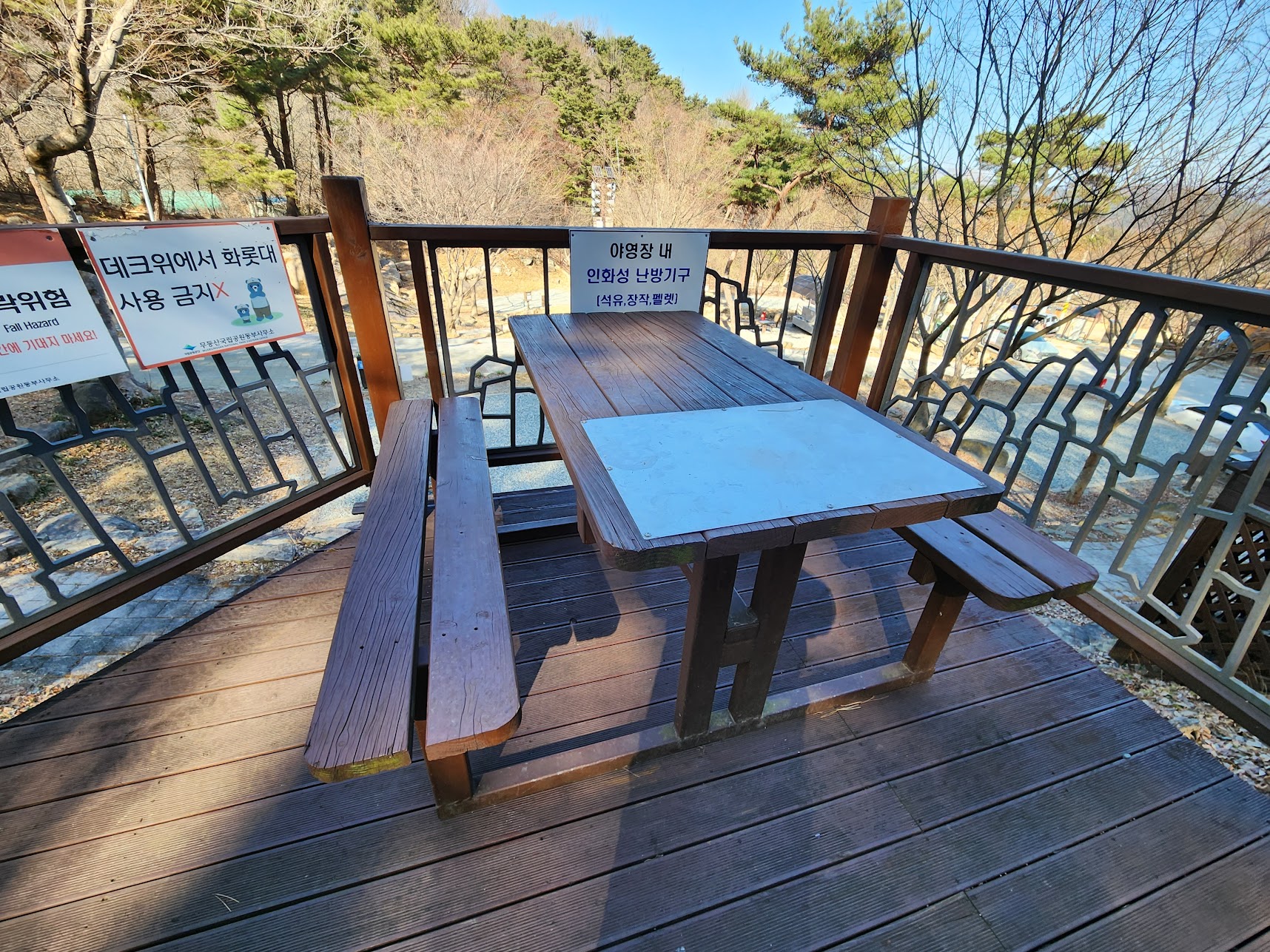 이게 어딜 봐서 데크냐고 할 분들도 계시겠으나 어쨌거나 나무 구조물이라서 냉기나 습기가 올라오지는 않습니다. 또한 캠핑장을 내려다보는 뷰도 나름 독특합니다. 대신 단점도 있는데, 나무 테이블 위치까지 포함해 4.5m * 5.5m 정도의 크기라 거실형 텐트는 사실상 치기가 어렵습니다. 또한 나무 구조물 위라서 어떠한 경우에도 화로대를 쓰지 못합니다. 이건 주의사항이 적혀 있으니 '몰랐다'는 소리도 못 합니다.