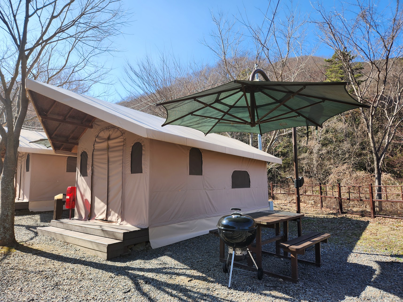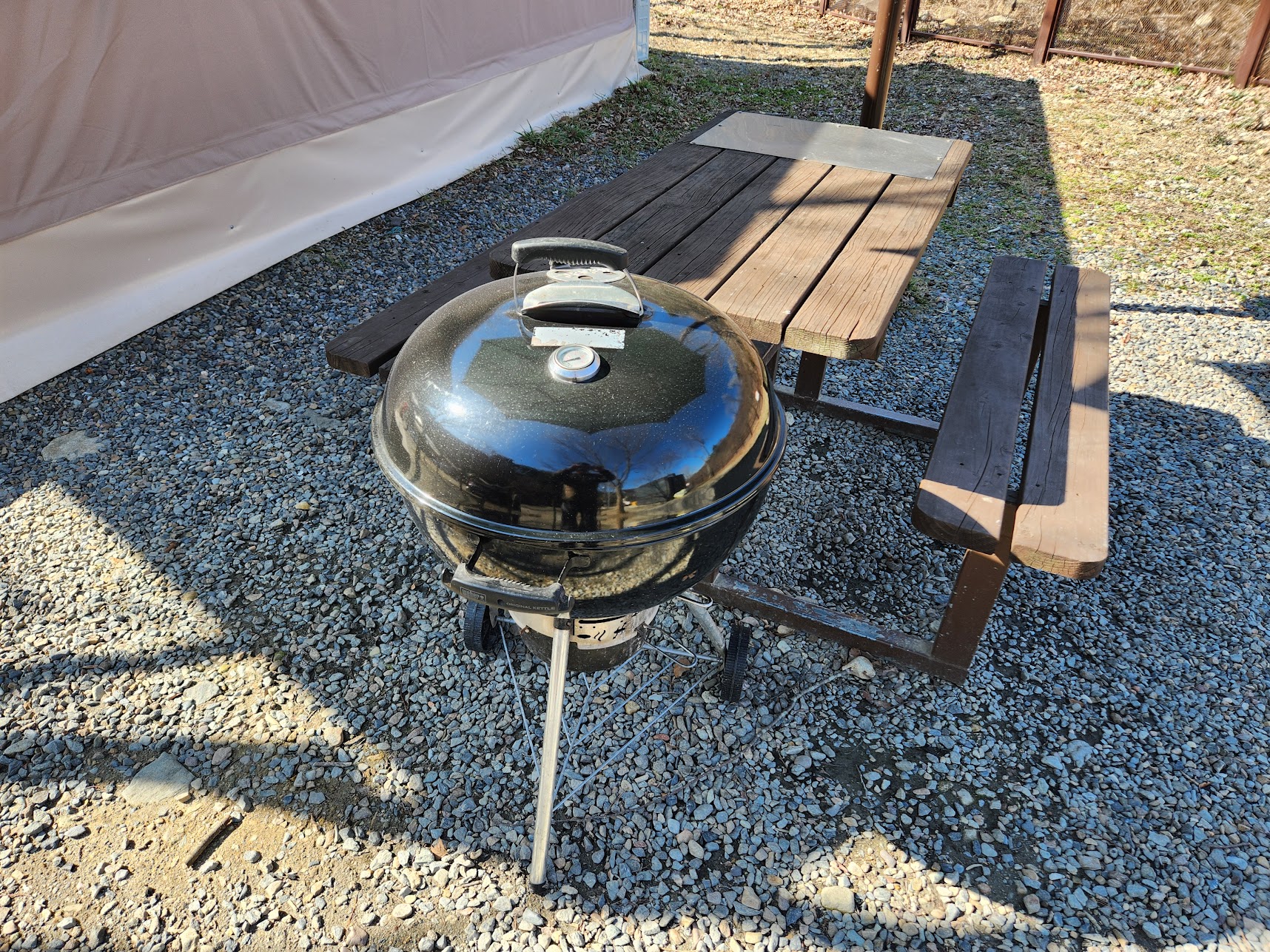 산막텐트의 시설은 어느 캠핑장을 가도 기본은 비슷합니다. 말 그대로 산막텐트 한 동에 파라솔이 있는 나무 테이블, 그리고 화로대입니다. 도원야영장의 화로대는 Weber BBQ 그릴이라 나름 고오급(?)입니다.