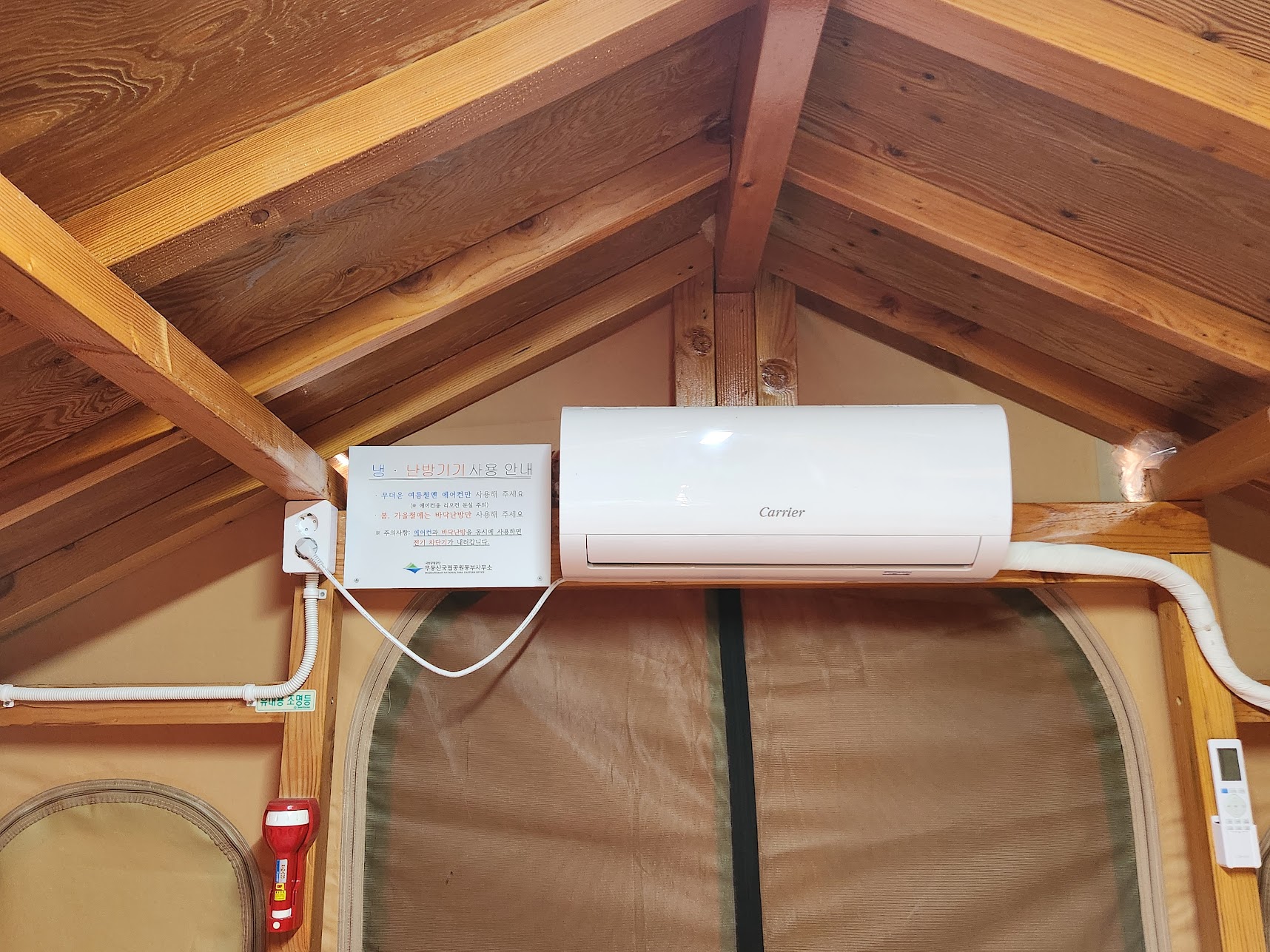 실내는 작년과 변화는 없으나 다시 또 적으면 이렇습니다. 산막텐트가 다 거기서 거기지... 사실 위에도 그렇게 적었지만 실상 속은 꼭 그렇지 않다는 것을 보여주는 것이 이 도원야영장입니다. 여기는 다른 캠핑장의 산막텐트보다 고오급(?)입니다. 텐트 자체는 3m * 6m 크기의 일반적인 규모지만 먼저 안을 보면 위에 낯익은 네모난 것이 보입니다. 예. 에어컨 되겠습니다. 지금 계절에서는 쓸 일이 없지만 한두달만 지나도 남도의 무더움을 식혀주는 막강한 무기가 될 것입니다. 바닥난방은 전기난방이며, 의외로 후끈후끈합니다. 10단계에서 7~8단계만 놓아도 뜨겁습니다.