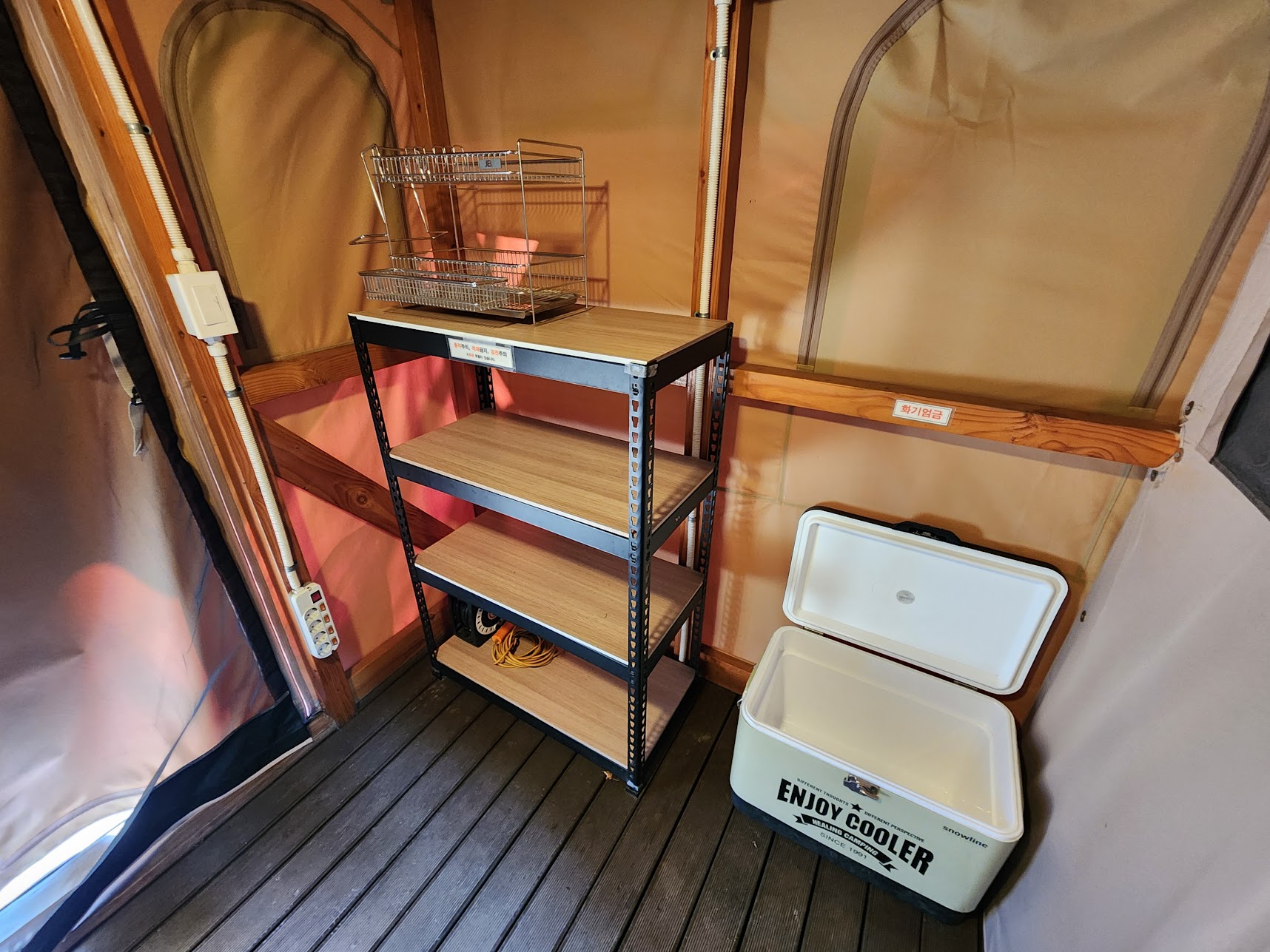 전실 공간도 고오급입니다. 보통 이 공간은 아이스박스 말고는 아무것도 없어서 그냥 짐 놓는 공간이 되지만, 도원야영장의 산막텐트는 전실도 효용성이 높습니다. 아이스박스는 기본이며 짐 보관용 랙에 식기건조대, 밖에서 쓸 수 있게 되어 있는 릴 케이블과 작업용 조명등까지 비치되어 있습니다. 반대쪽에도 간이 의자로 되어 있어 날씨가 궃다면 실내에 비치된 간이 테이블을 꺼내 실내에서 활동을 할 수 있습니다. 식기가 없다면 미리 대여 서비스를 신청하면 빌려도 줍니다. 이 때문에 이곳 산막텐트에 '풀옵션'이라는 말이 붙습니다.