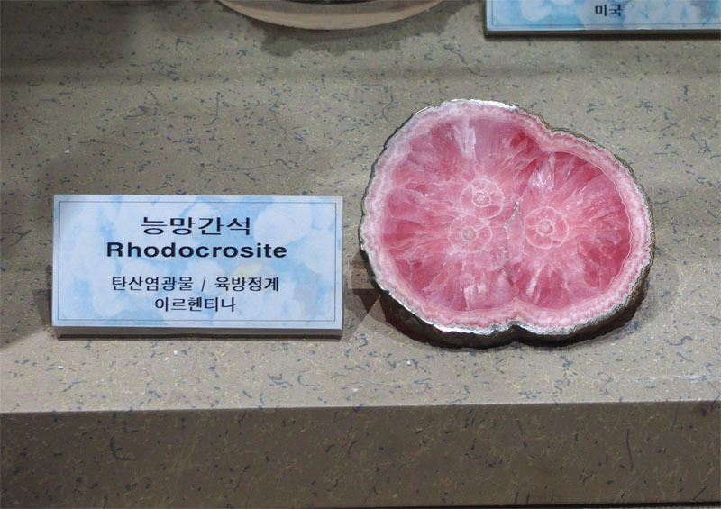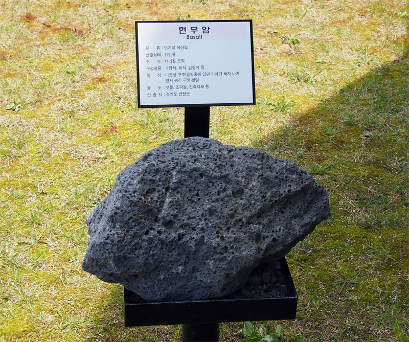 입구에는 여러 광물 표본이 전시되어 있습니다. 특이 광물은 박물관 안에 전시해 놓지만, 국내에서 구할 수 있는 흔한 것들은 여기서 볼 수 있습니다. 위 사진의 표본은 콩을 깔 때 갈 때 제맛인 광물입니다.^^ 옥외 전시한 광물은 대부분 그냥 골재로 쓰는 것들입니다.