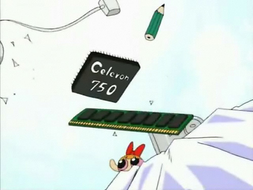 하여튼... 이 장면에는 오류가 하나 숨어 있습니다. PC를 잘 아는 사람도 정확히 짚어내지 못하는 문제인데 바로 'Celeron 750'입니다. 이 넘의 애니메이션이 나온게 Pentium III가 활개치고 다닐 시절이니 Celeron 750MHz가 나온다고 해서 문제가 될건 없어 보이지만 사실 그게 반드시 '틀린게 아니잖아' 할 문제가 아닙니다. 저 사진은 두 가지 오류가 있기 때문입니다.